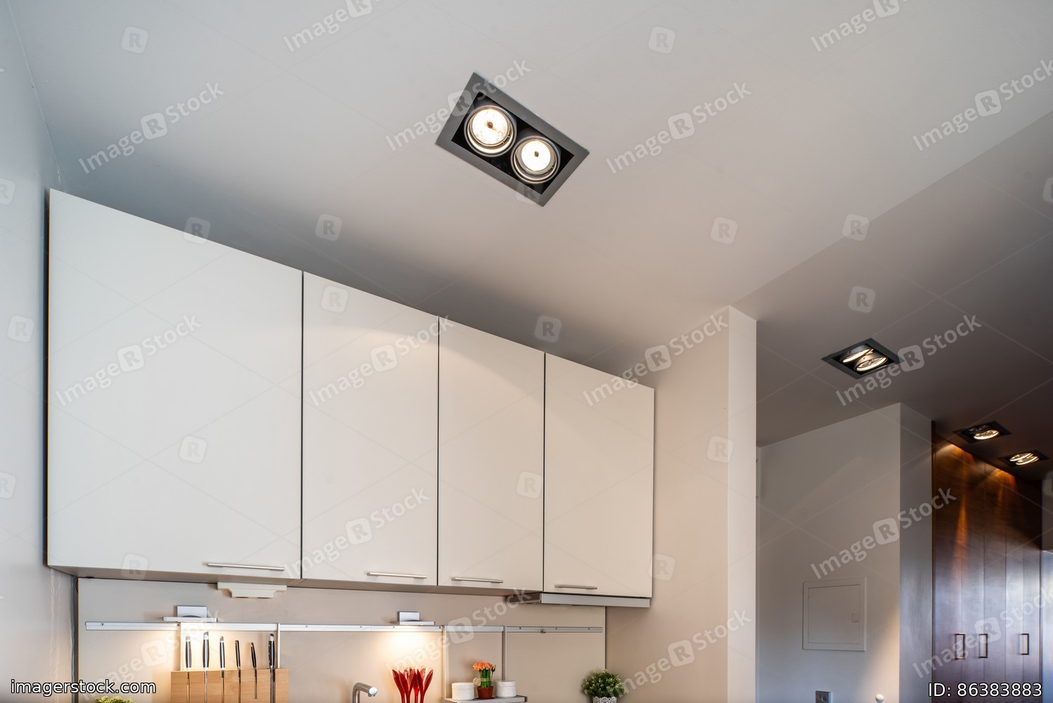 Sloping ceiling with lamps in modern studio apartment.