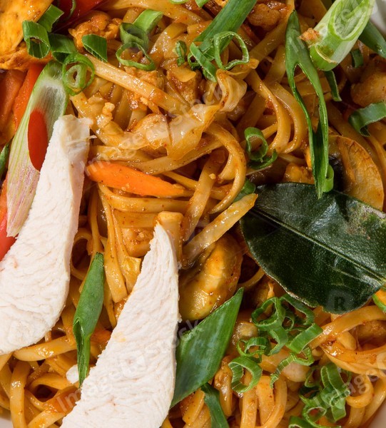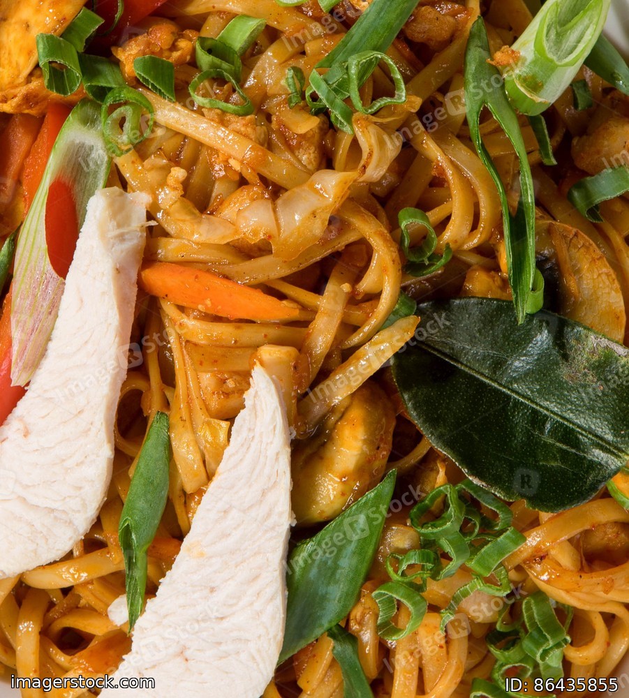 Close-up of noodles with chicken meat. Tasty food. Asian cuisine.