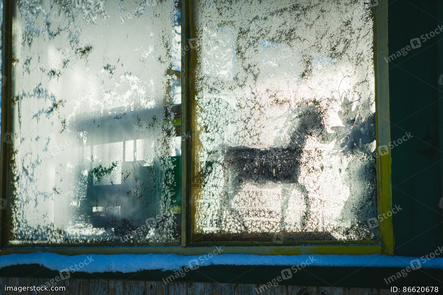 Silhouette of horse toy on sill behind window. Frost patterns on glass