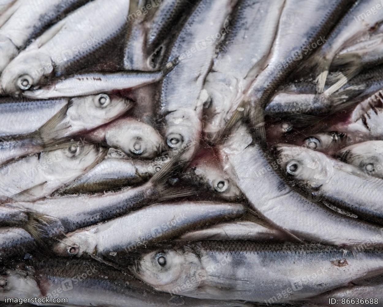 Close-up of frozen sprat in fish market. Winter fishing. Small silver fish production.