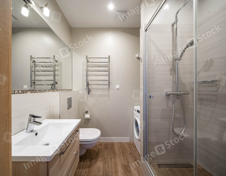 Contemporary interior in light tones of modern bathroom. Shower cabin. Sink and mirror. WC toilet.