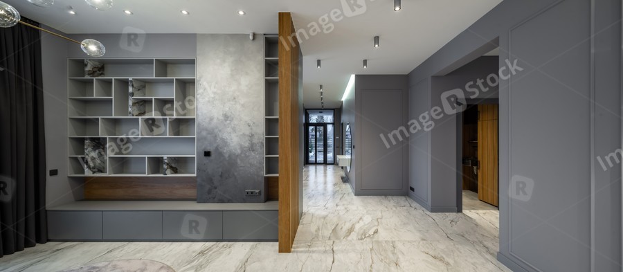 Luxury interior. Grey colors. Wooden design. Shelves on wall.
