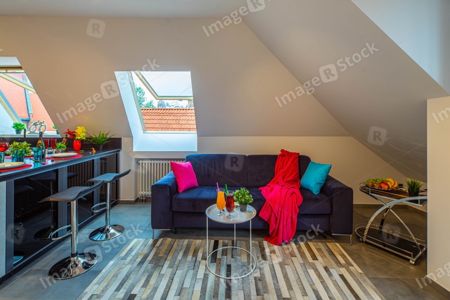 Loft interior of modern flat. Studio apartment. Set table. Cozy sofa. Roof windows. Drinks and food.