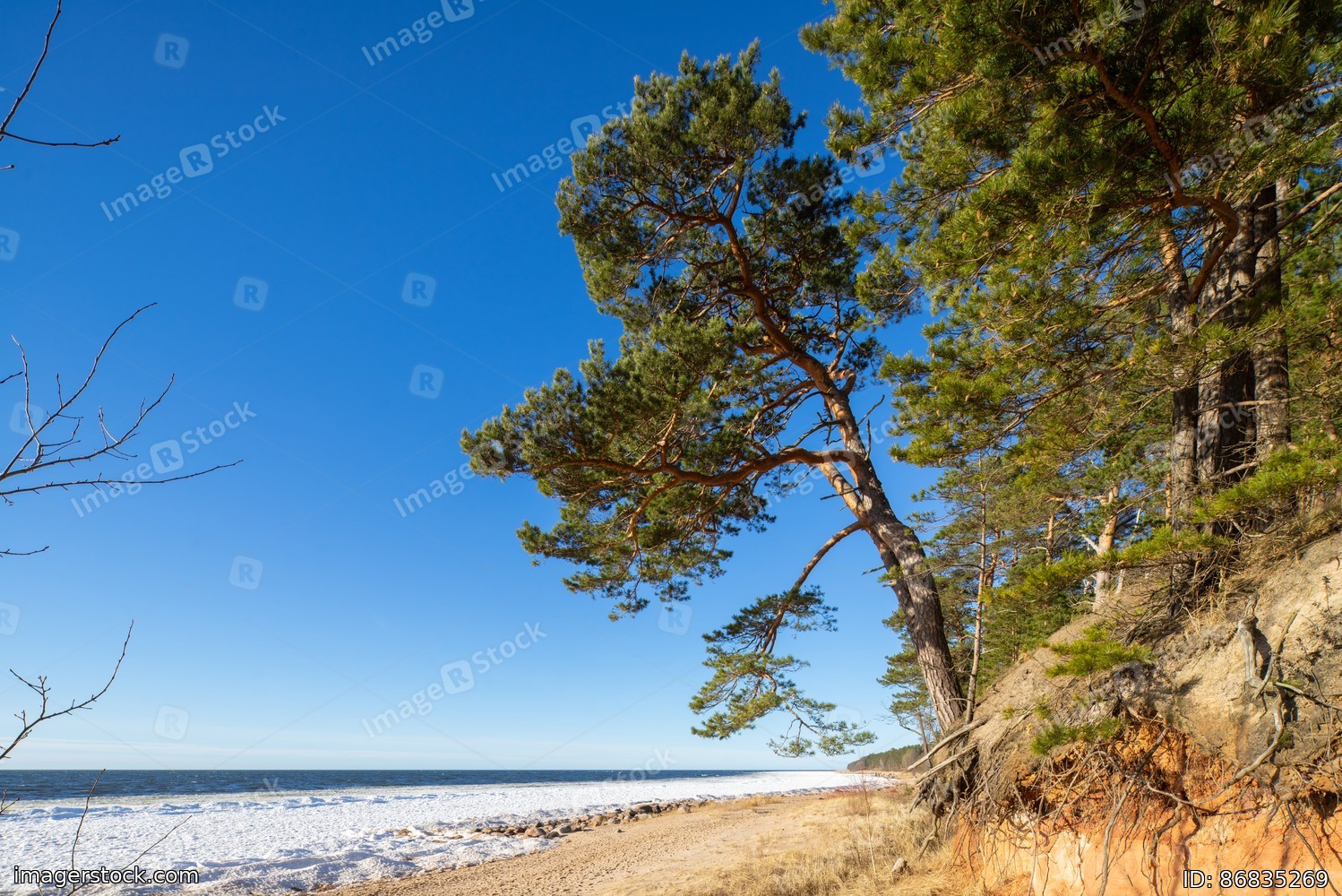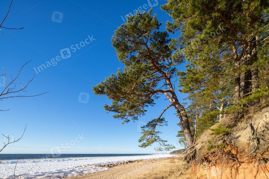 Beautiful landscape of Baltic sea. Sunny day. Pine trees.