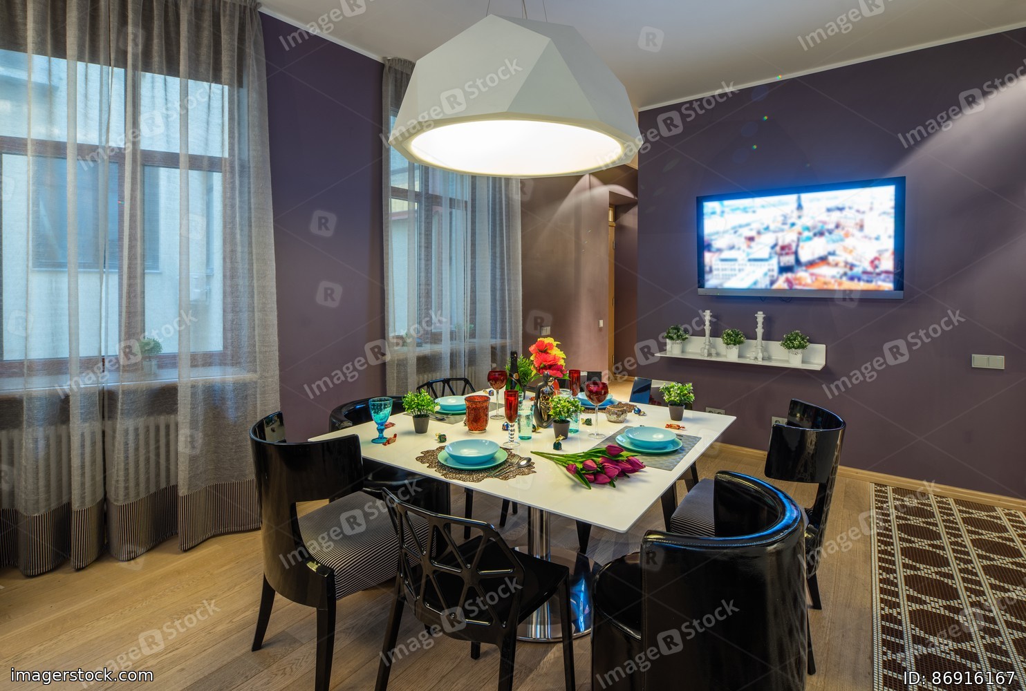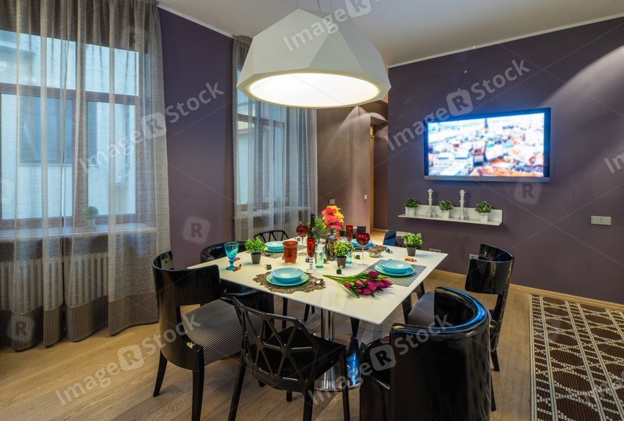 Living room. Windows with curtains. Set table. White cabinets.