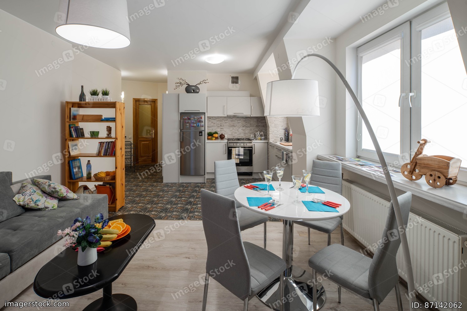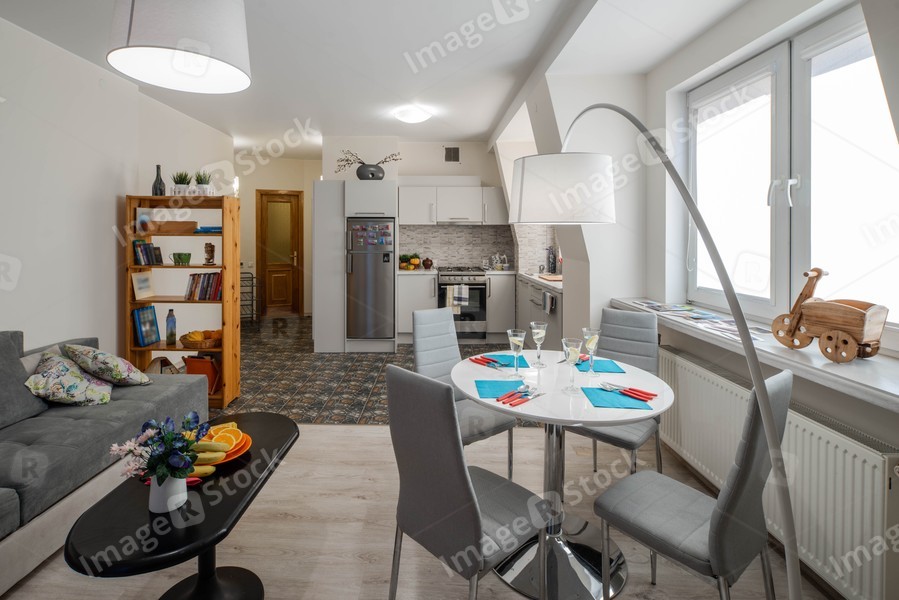 Spacious studio apartment with furniture. Living room. Kitchen. Light interior.