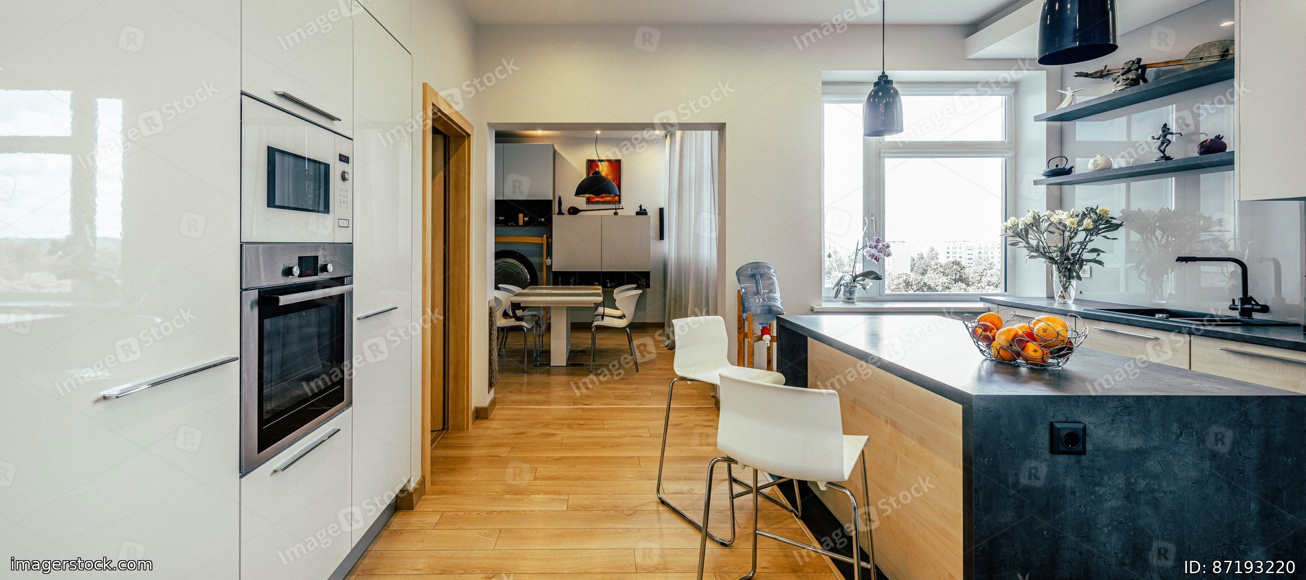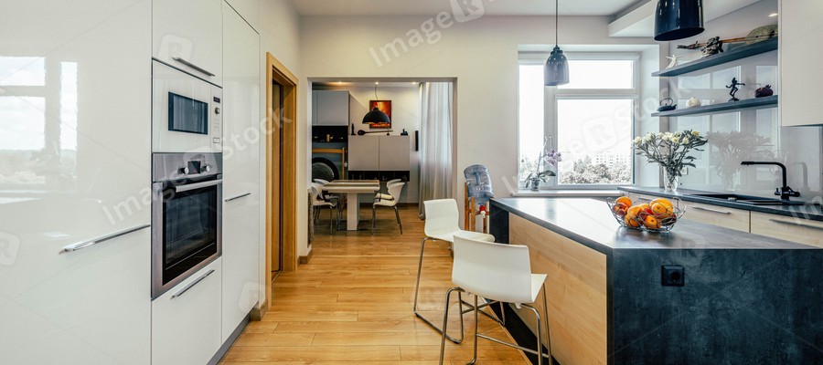 Modern interior of kitchen in luxury apartment. White built-in cabinets. Wooden kitchen set. Table and chairs. Living room.