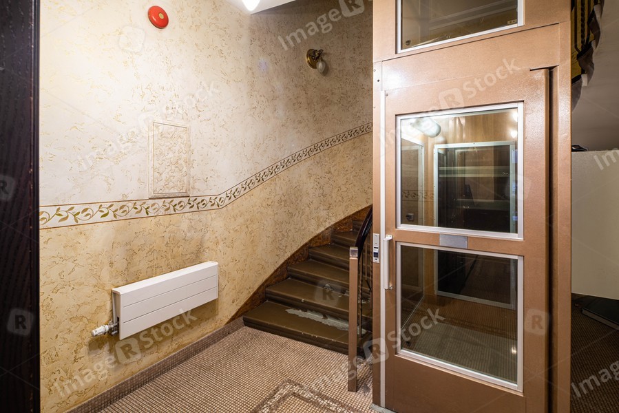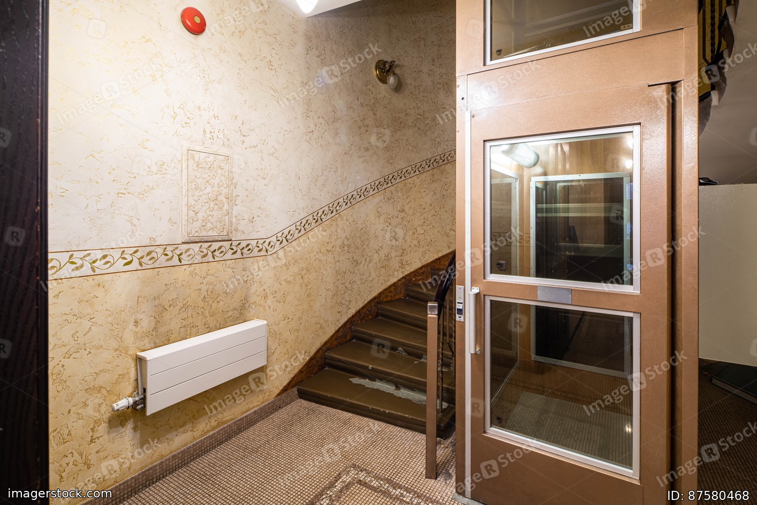 The entrance in a luxury living complex. Modern interior. Staircase.