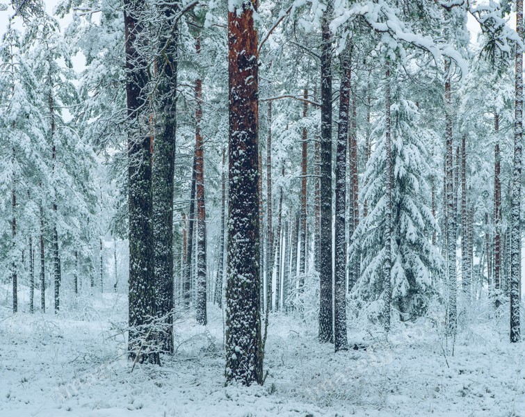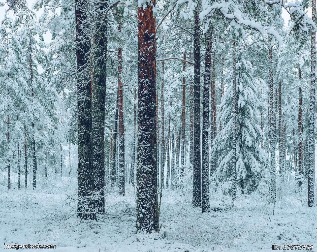 Beautiful winter landscape. Pine forest. Trees covered by snow