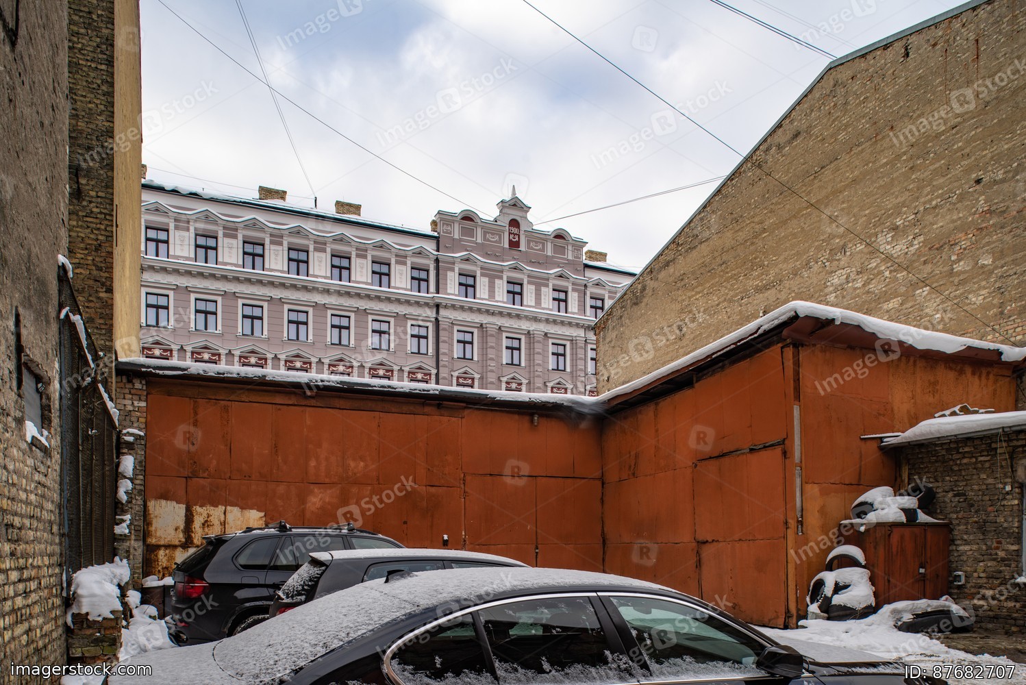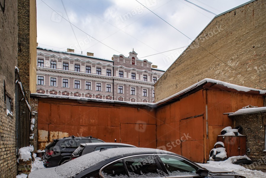 Parking in the courtyard of a residential building. Winter cityscape.