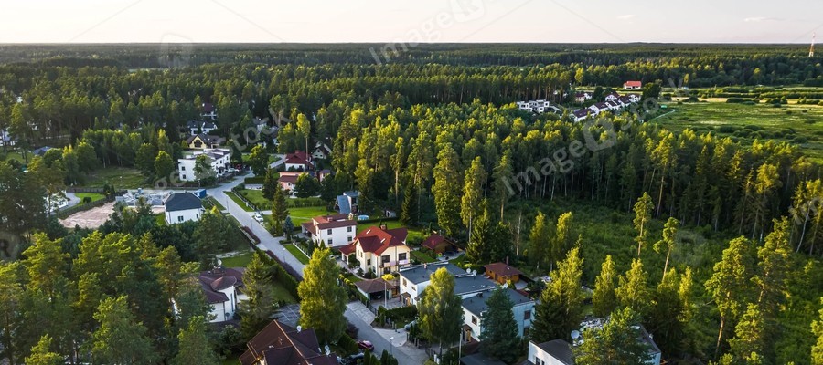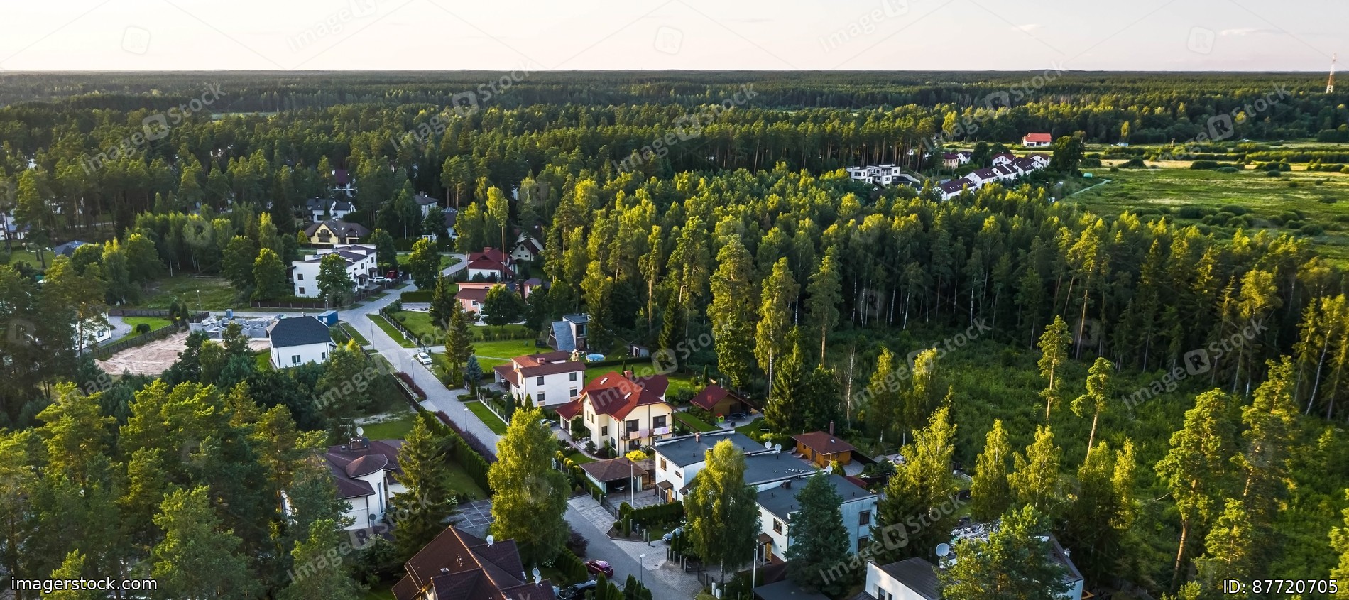 Aerial panorama view of private sector in european city. Luxury exterior. Green trees. Cars and houses.