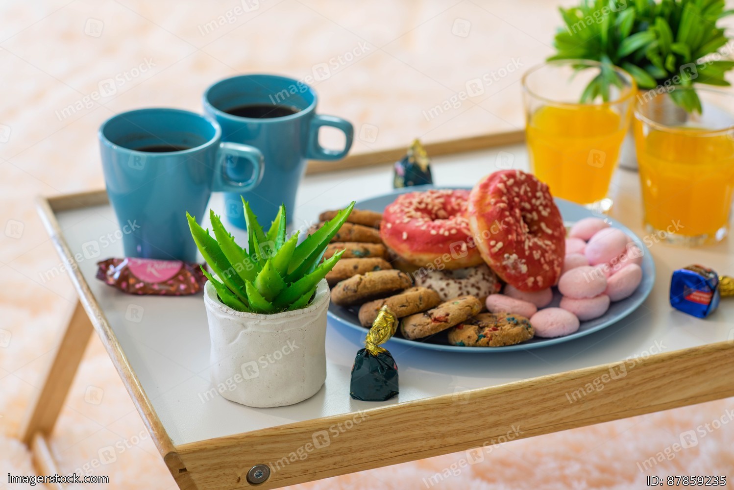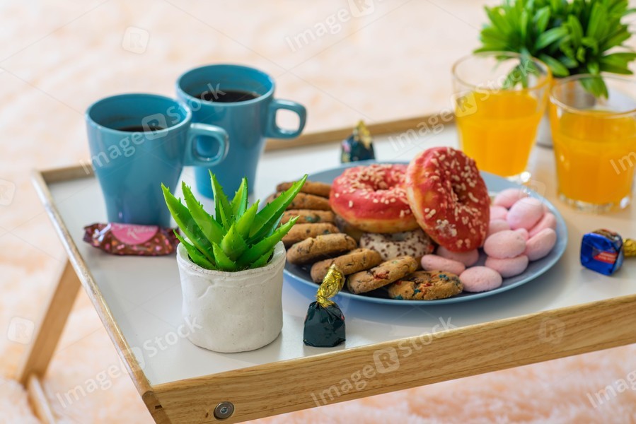 Romantic breakfast composition on the tray with food.