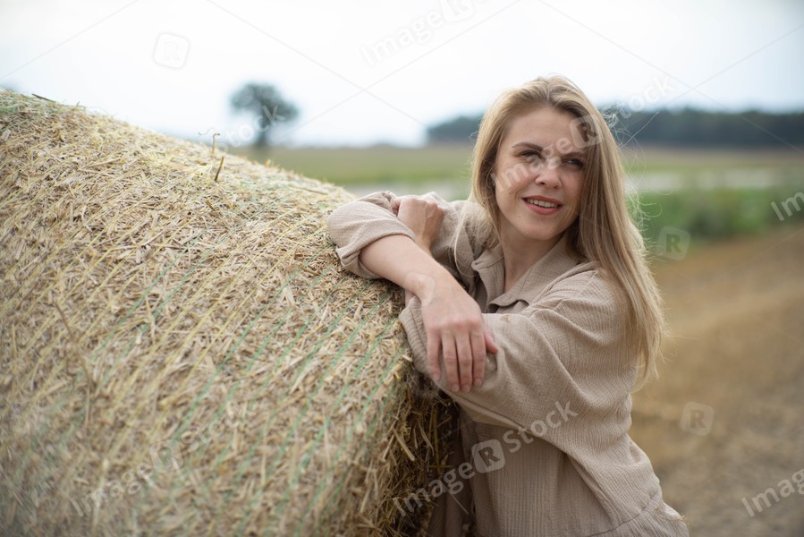Beautiful happy woman near a haystack. Countryside.