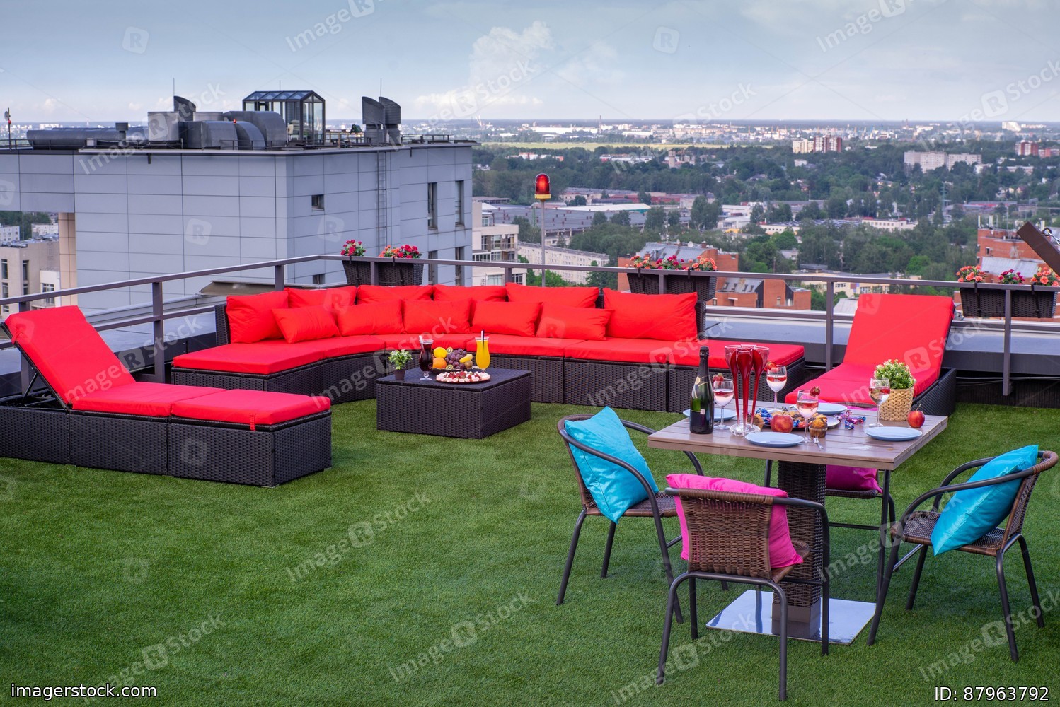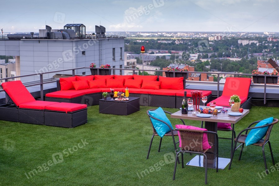View of city from the rooftop terrace. Relax zone with furniture and jacuzzi.