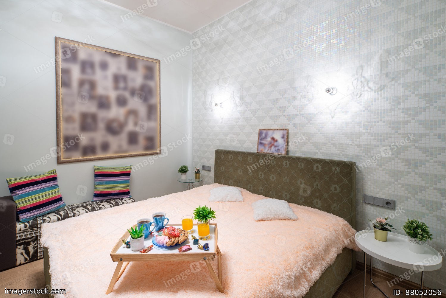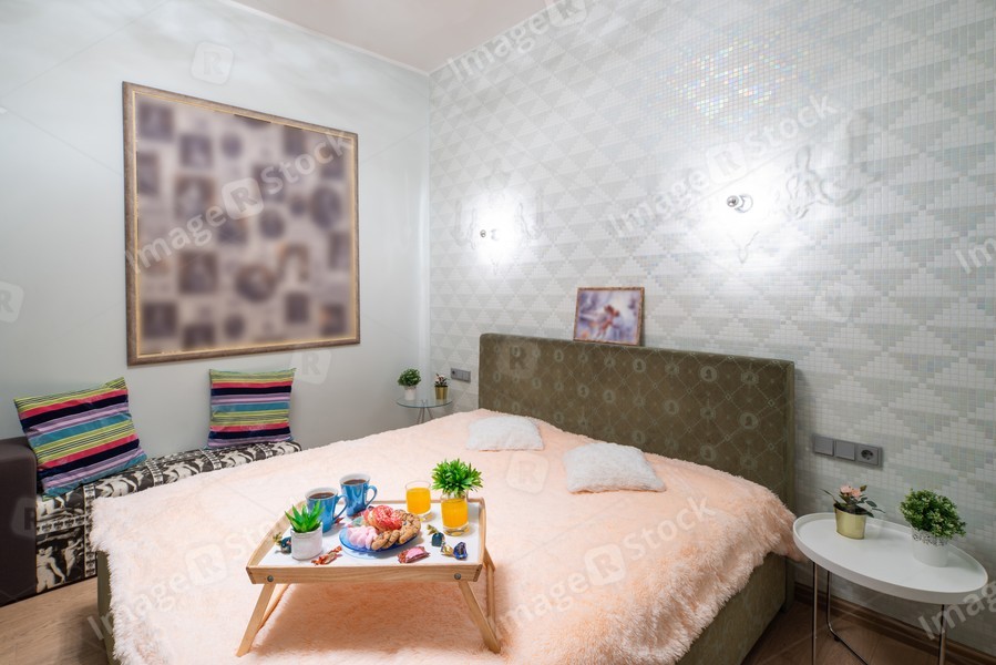 Modern interior of bedroom in studio apartment. King-size bed.