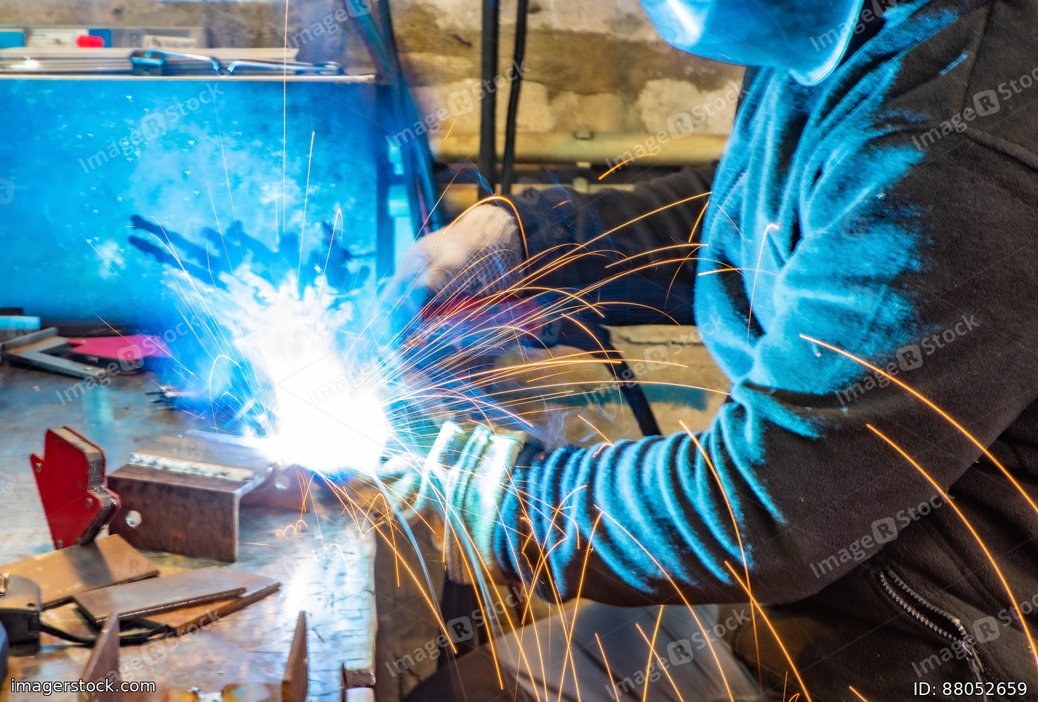 Worker in welding mask at factory. Welding process. Electric welding. Bright yellow sparks.