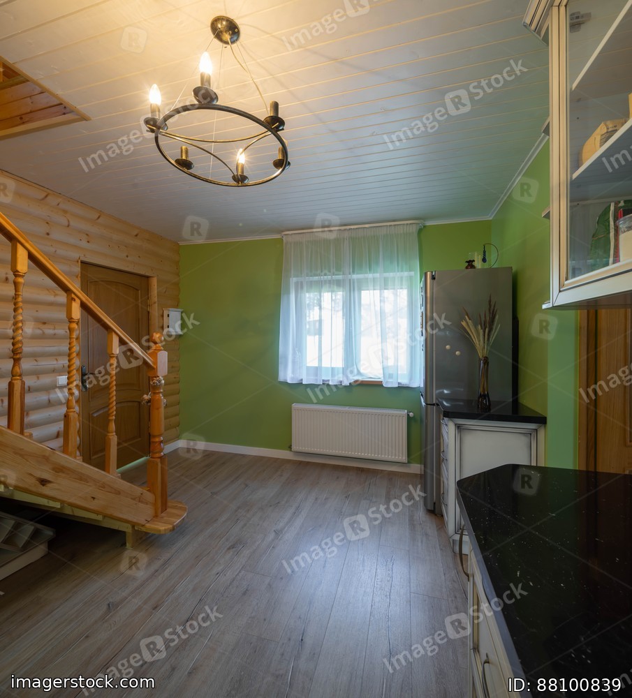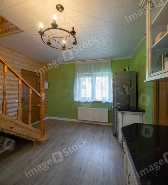 Modern wooden interior of entrance hall in private country house. Green wall.