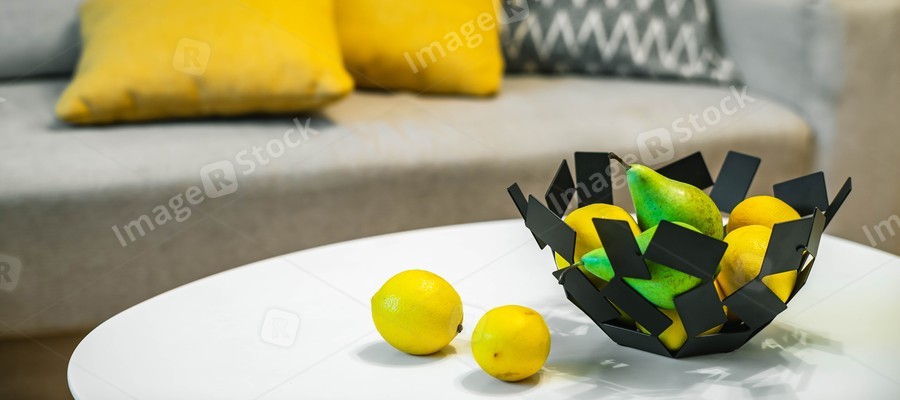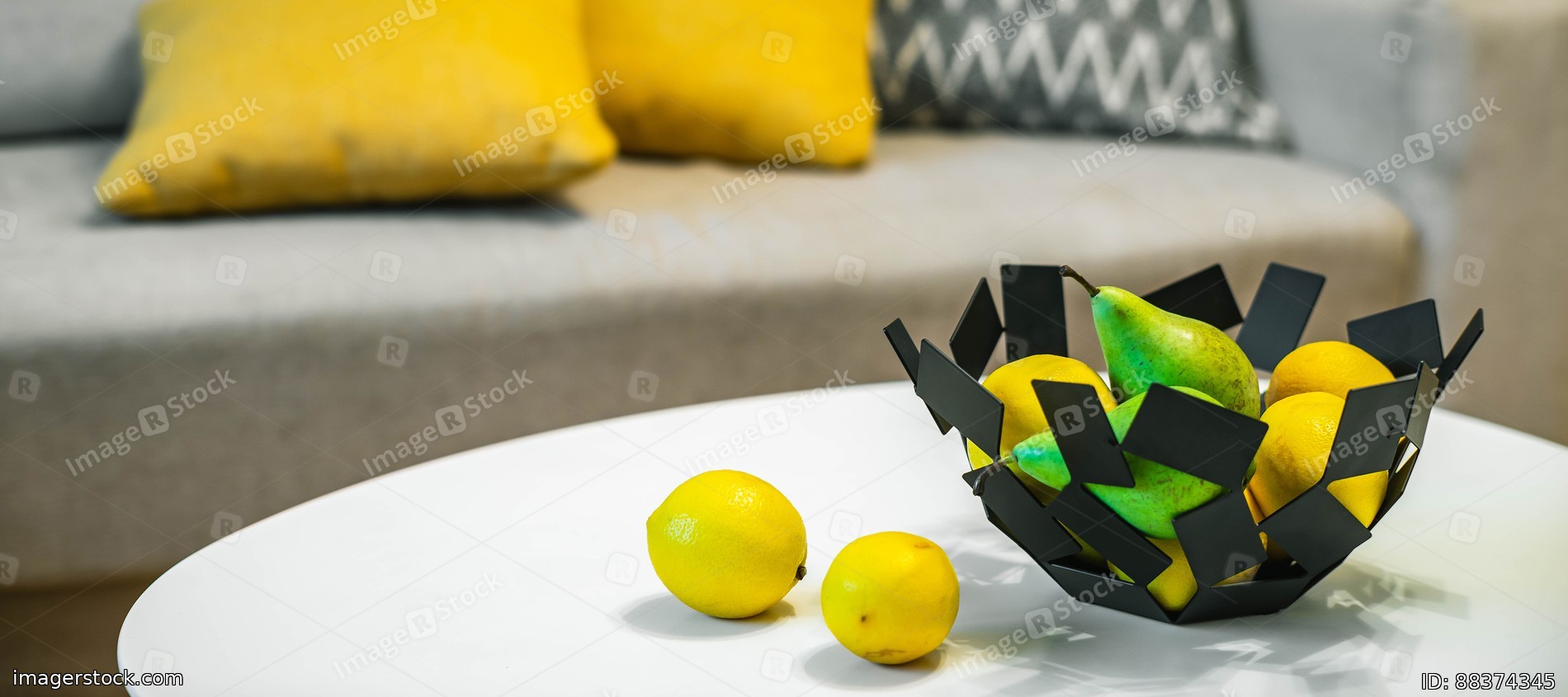 Close-up of decorative bowl with fruits on white table. Lemons and pears. Modern interior.