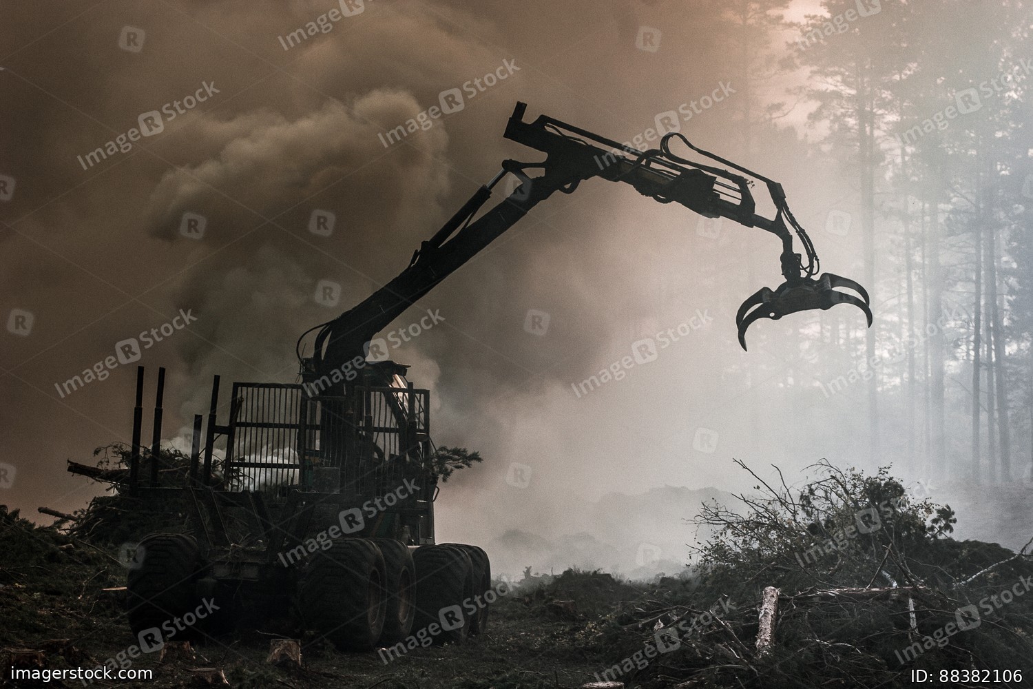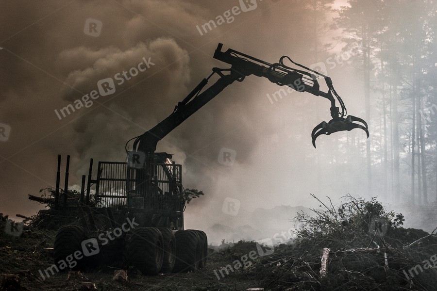 Forest cutting, burning of forest waste. Smoke and fire, tractor.