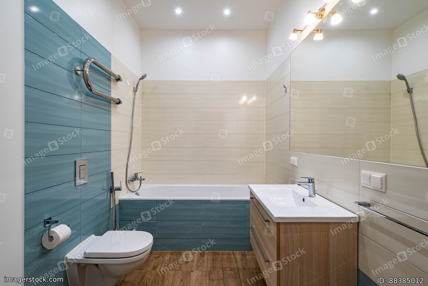Contemporary interior of luxury bathroom in apartment. Mirror and sink with wooden drawers. Bath and toilet.