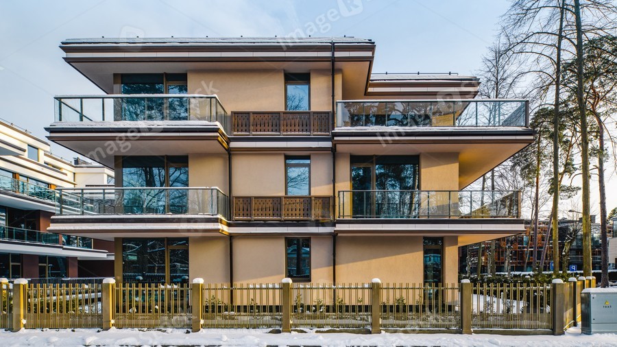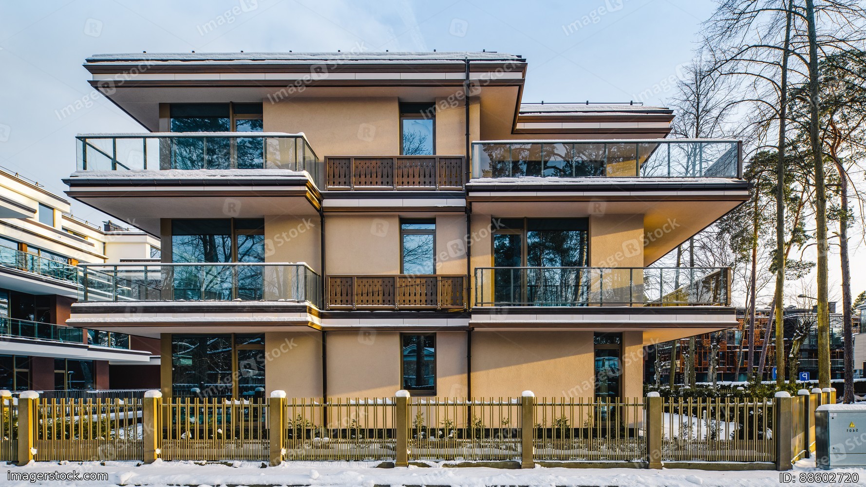 Modern facade of new luxury residential building at winter.