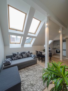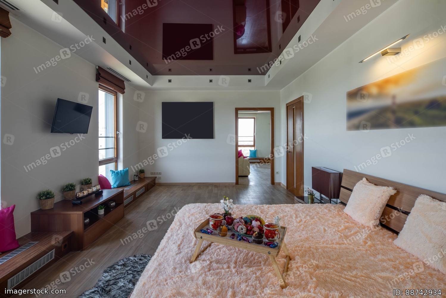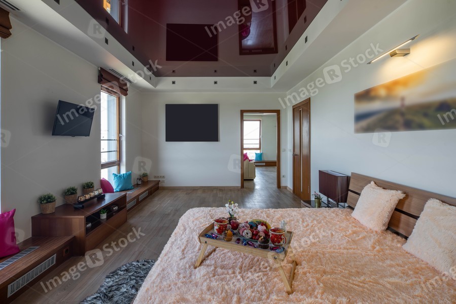 Bedroom in modern apartment. White walls. King-size bed. Light interior.