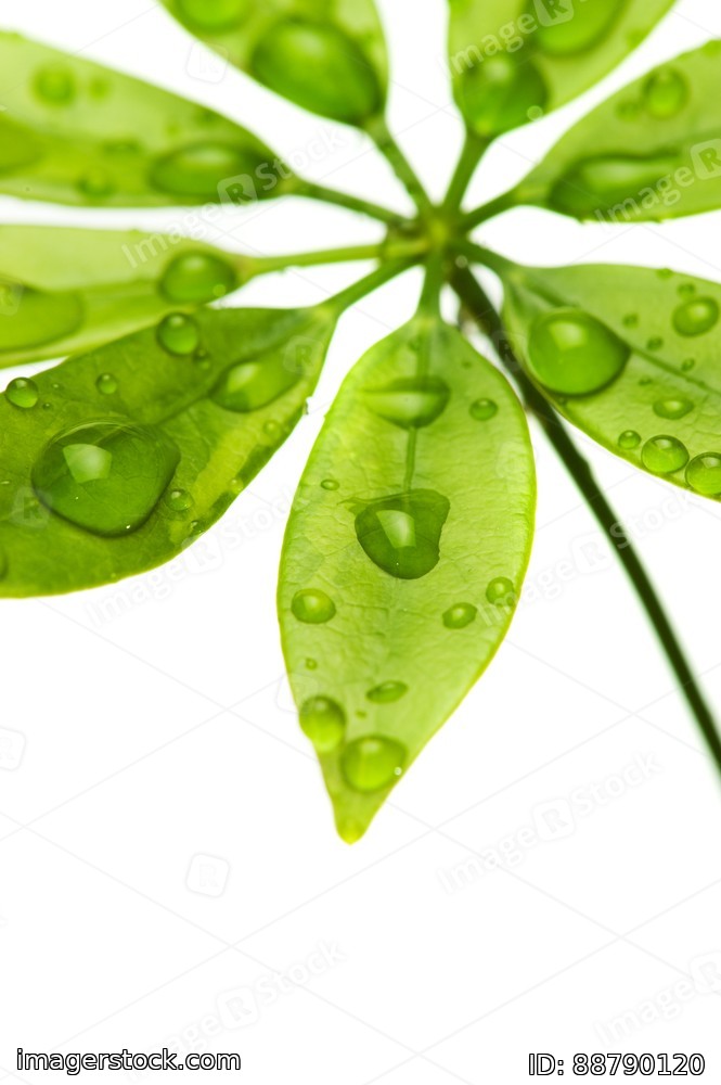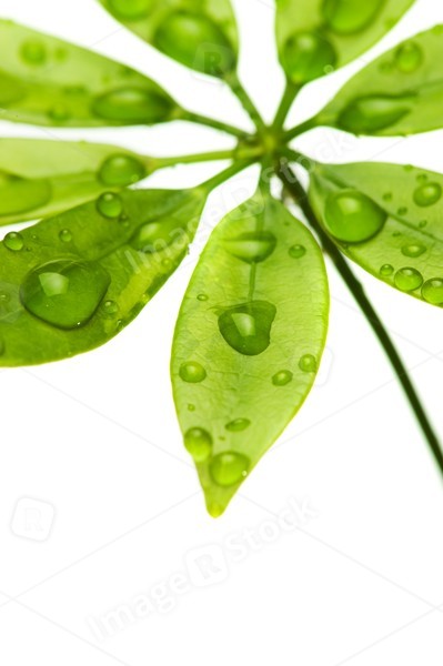 Water drops on fresh green leaves. Isolated on white background