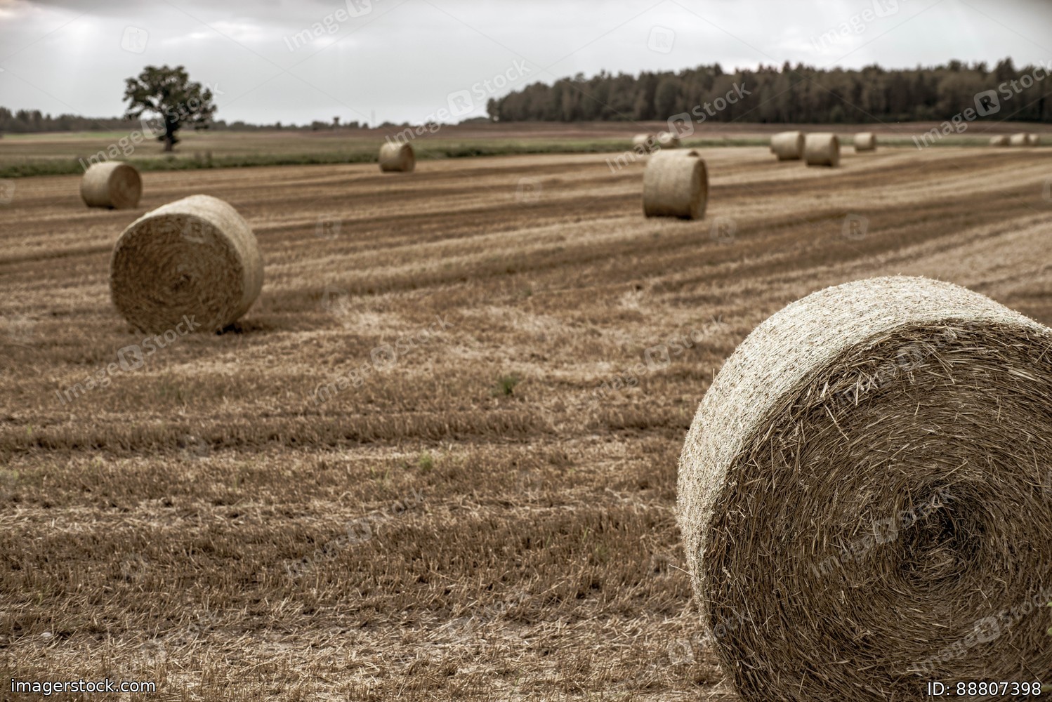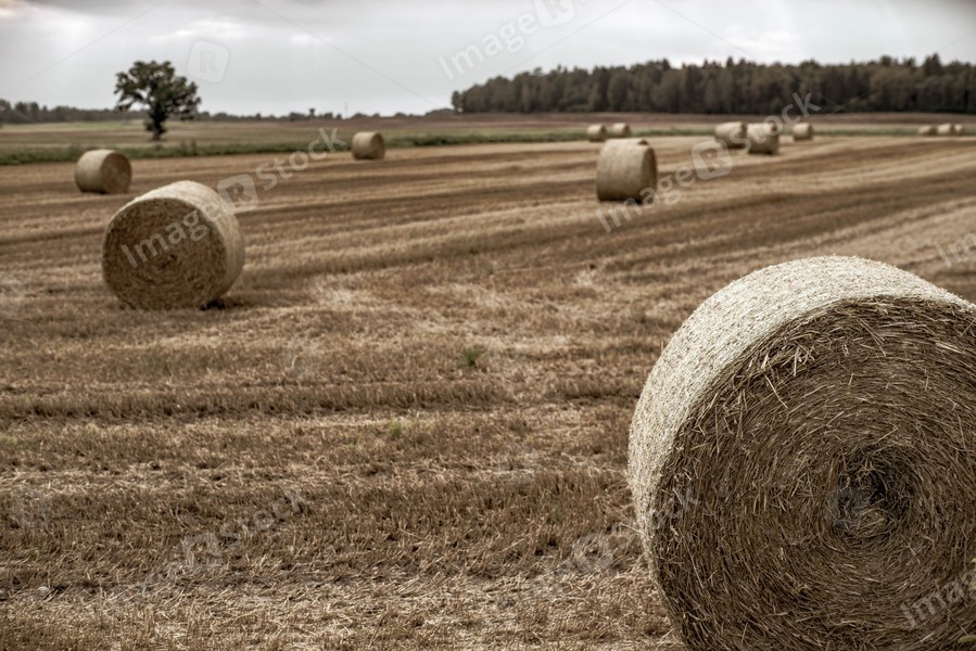 Harvest time. Field of haystacks. Latvian nature.