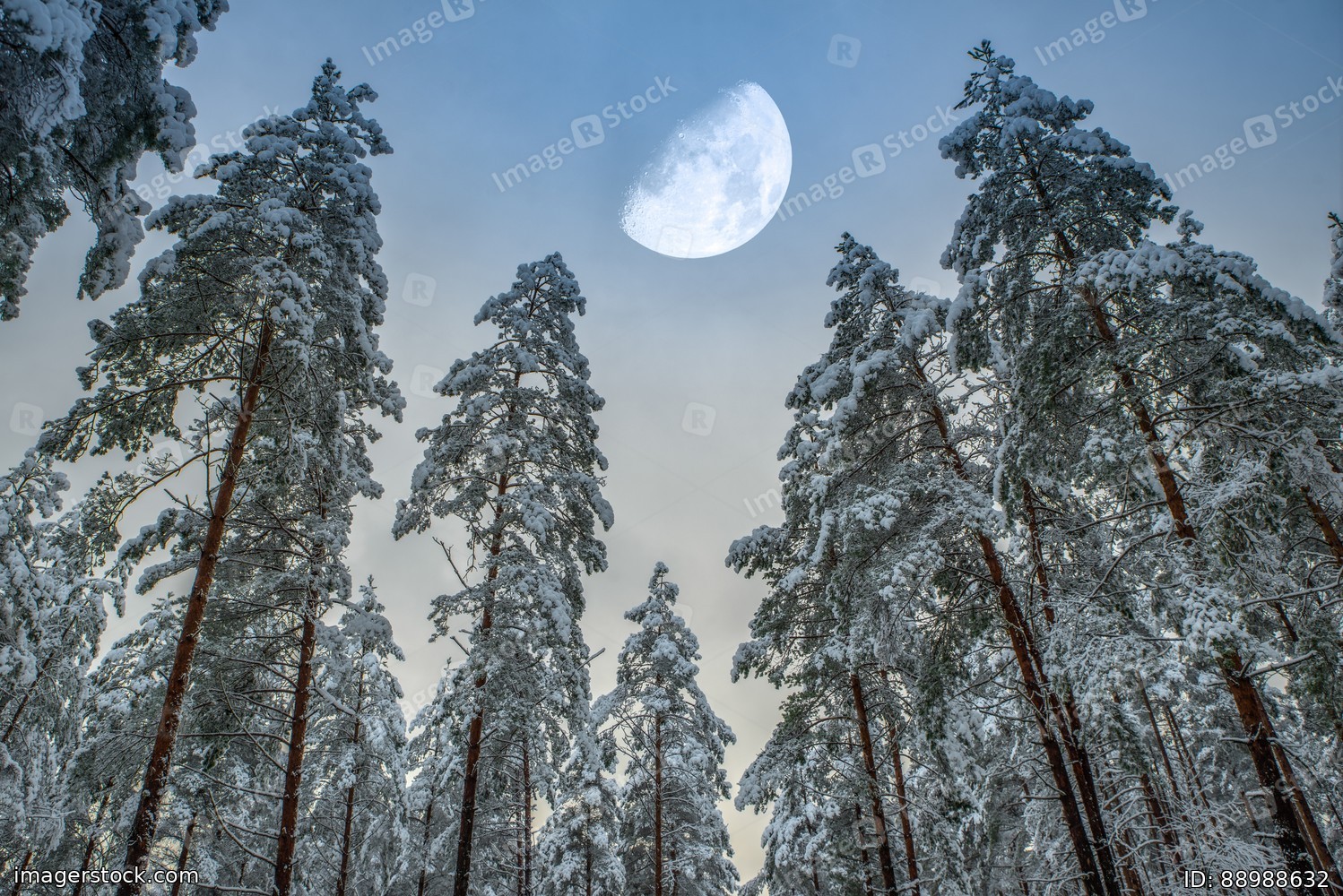 Beautiful landscape. winter forest. Bottom view of snowy treetops