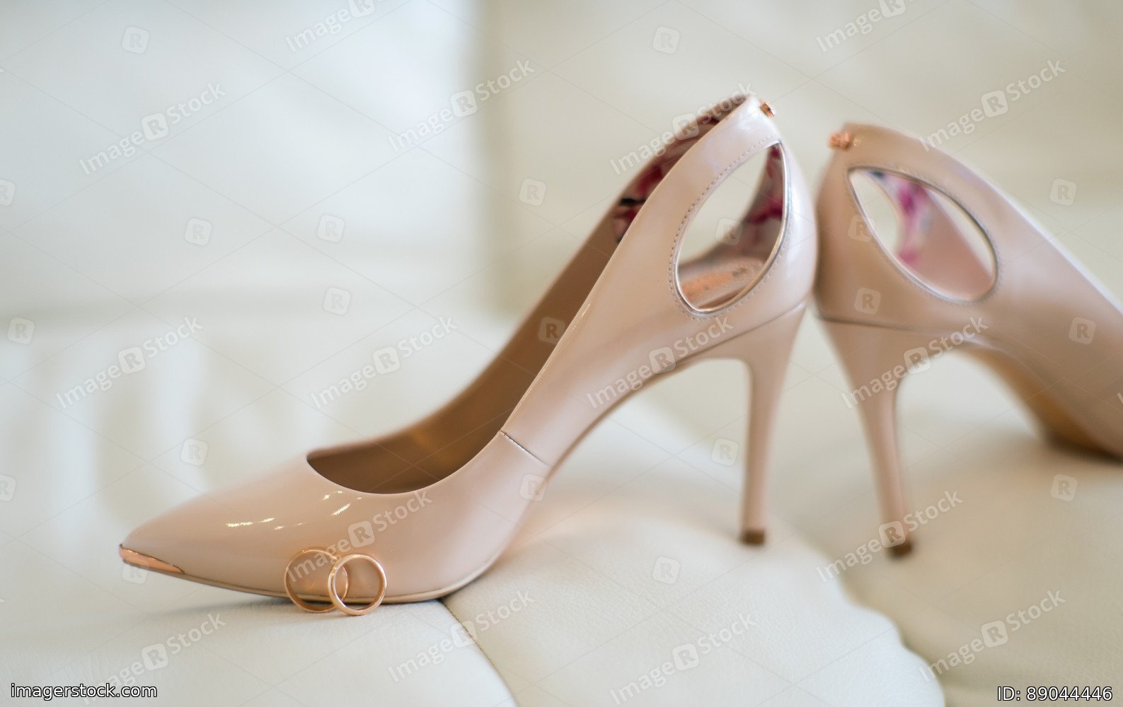 Bride's beige shoes and gold rings for the wedding.