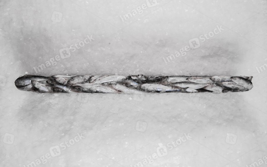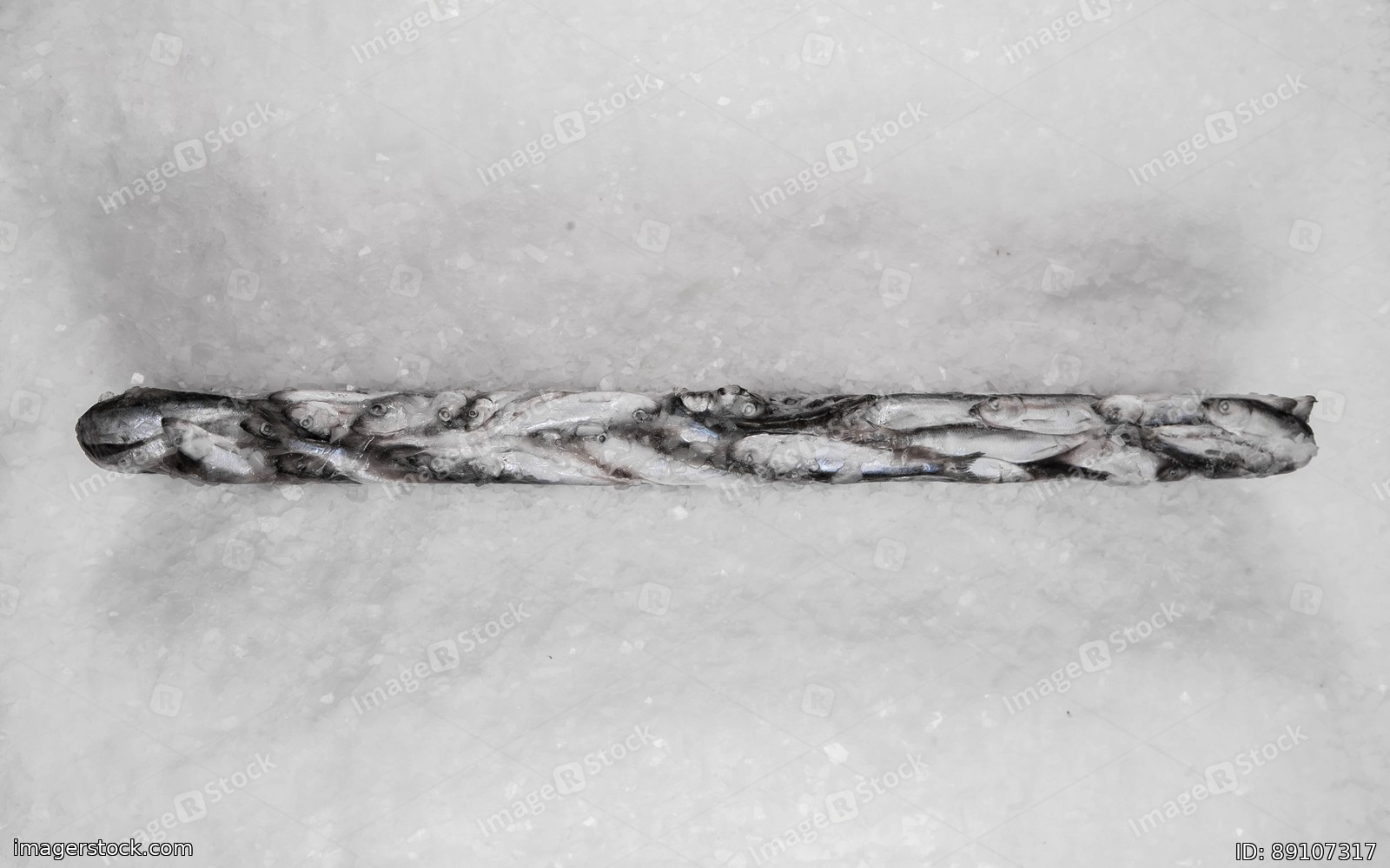 Close-up of sprat brick on the ice in fish market. Winter fishing. Frozen small silver fish. Top side view.