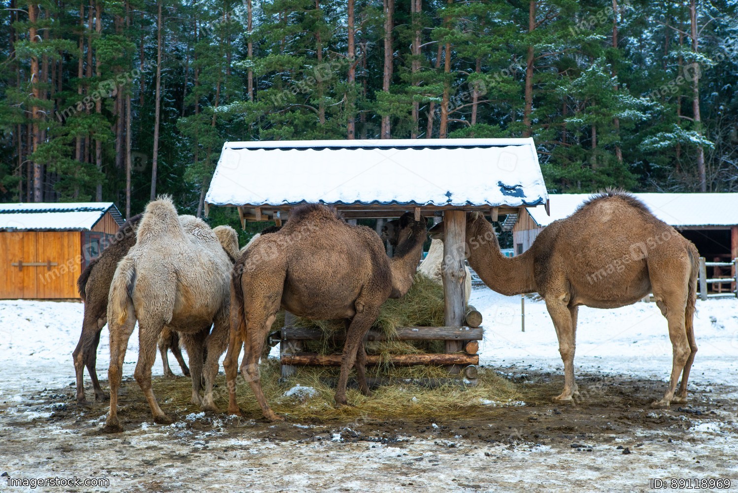 Camels eat hay at feeder in winter. Animals in modern zoo.