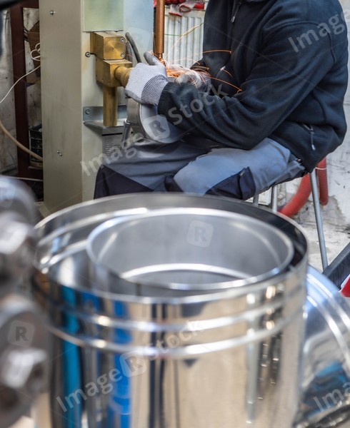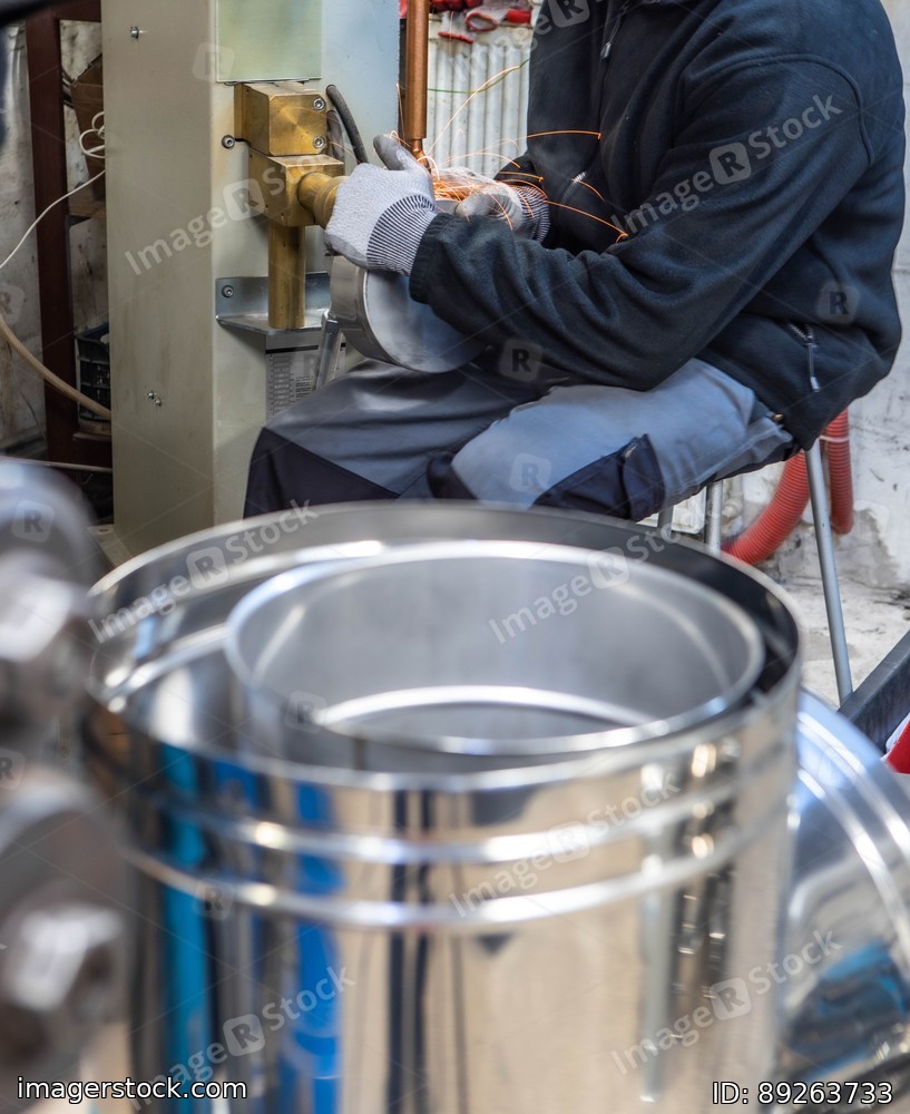 Welder in gloves is working at spot welding machine. Welding of pipes for chimneys.