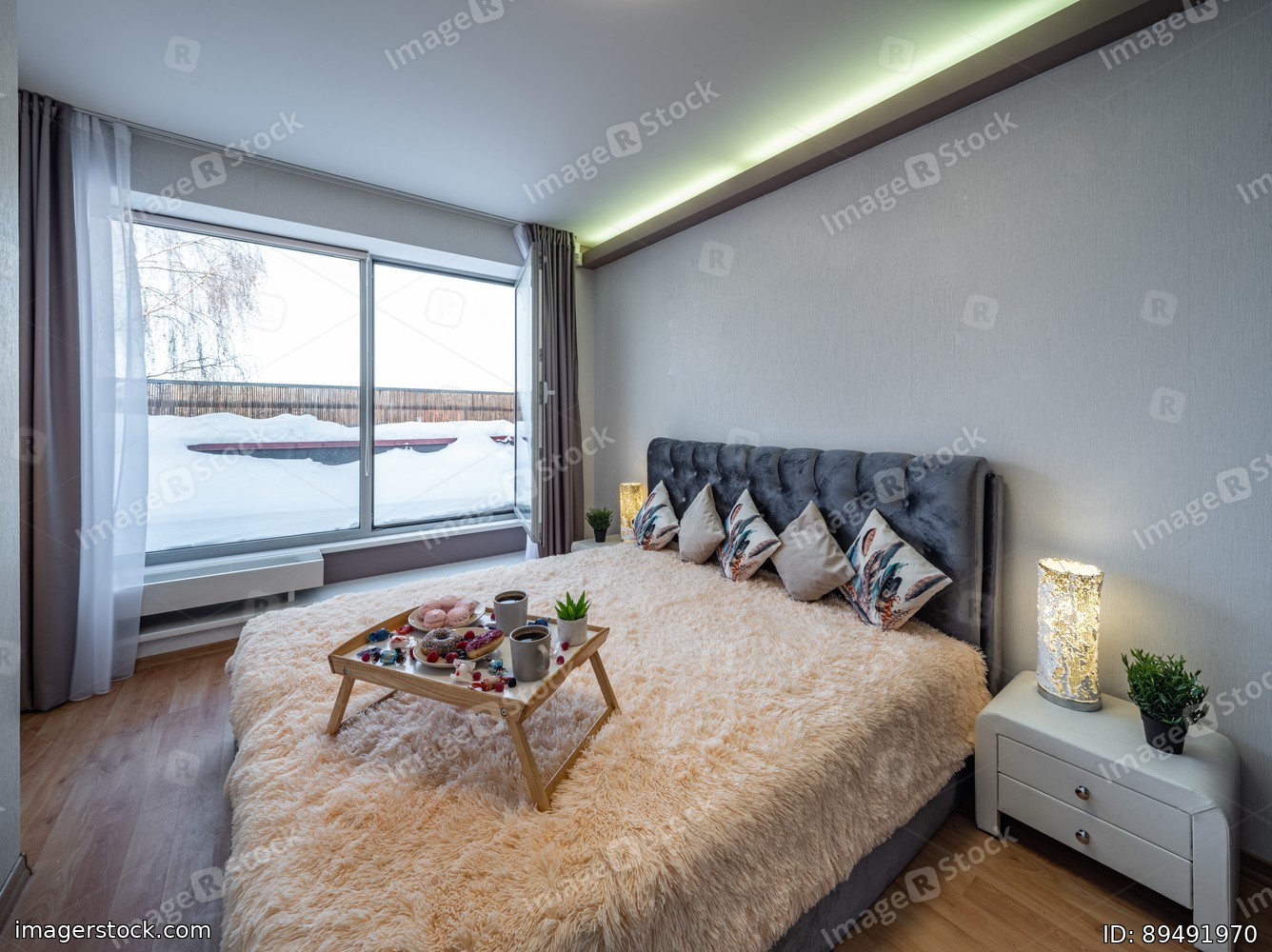 Modern interior of bedroom in luxury apartment. Breakfast on bed.