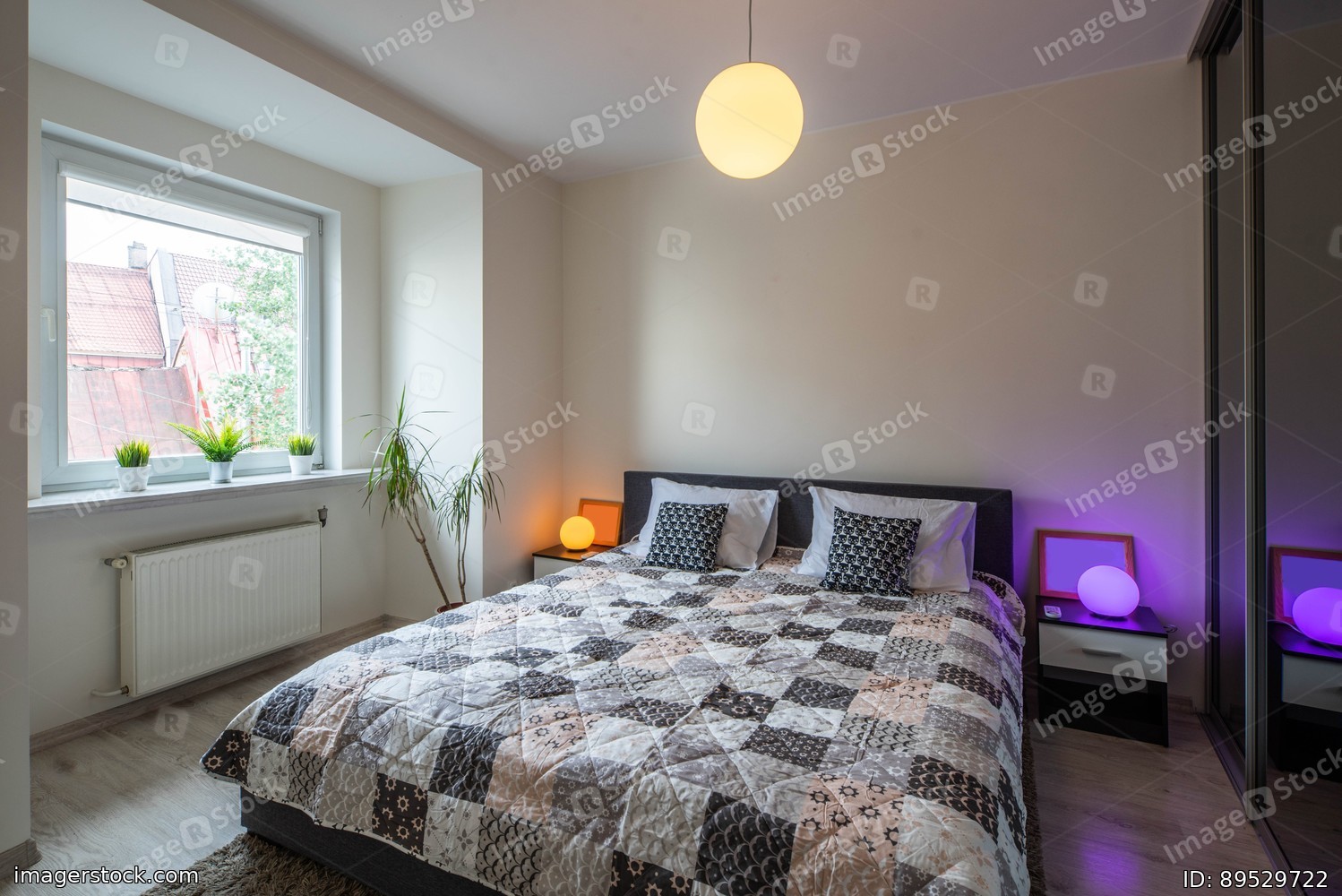 Modern interior of bedroom. Bed with pillows and blanket. Bedsides with round lamps.