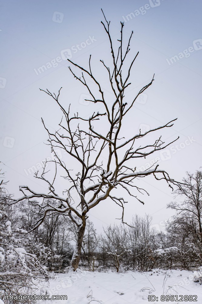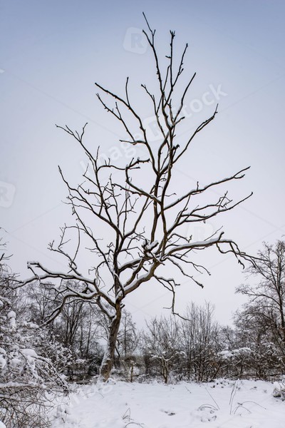 Scenic winter landscape. Beautiful nature. Snow-covered tree in the forest. Cloudy weather.