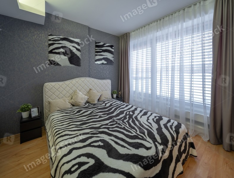 Modern interior of bedroom in luxury cottage. Zebra print bedspread.
