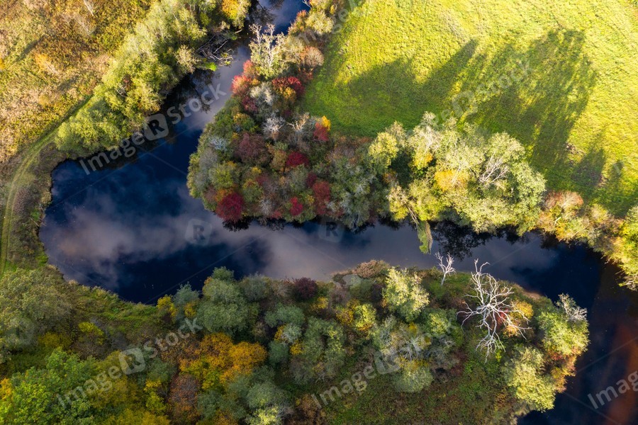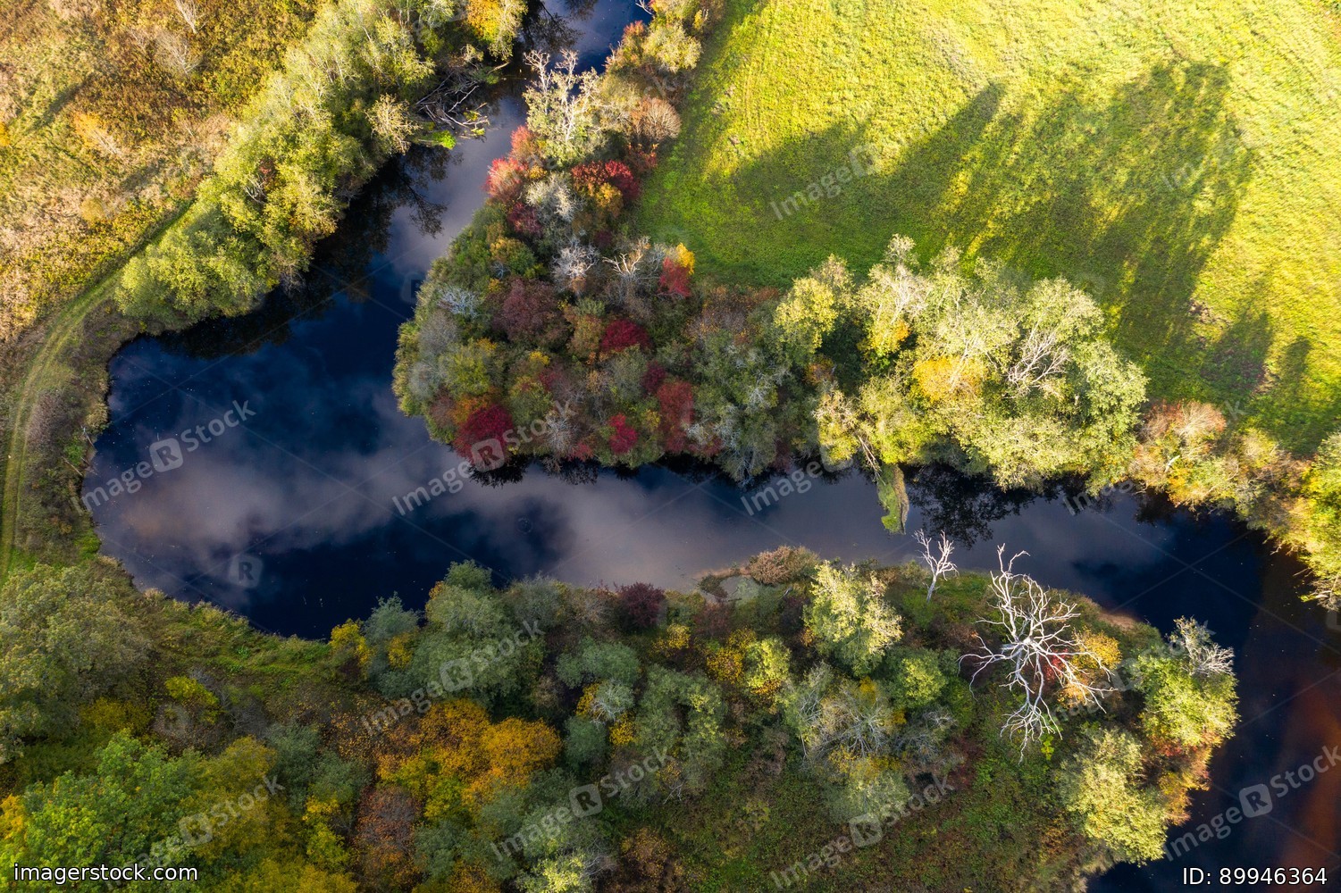 Latvian autumn nature. VIew from the top. Forest and river Jugla.