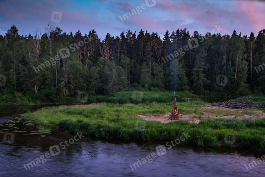 Landscape of forest and river at twilight. Huge fire. Midsummer Ligo celebration.