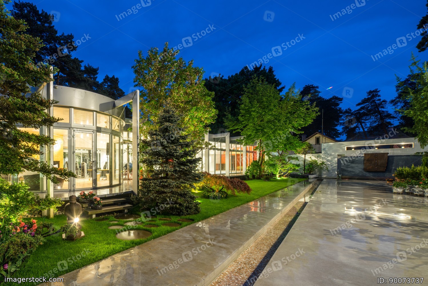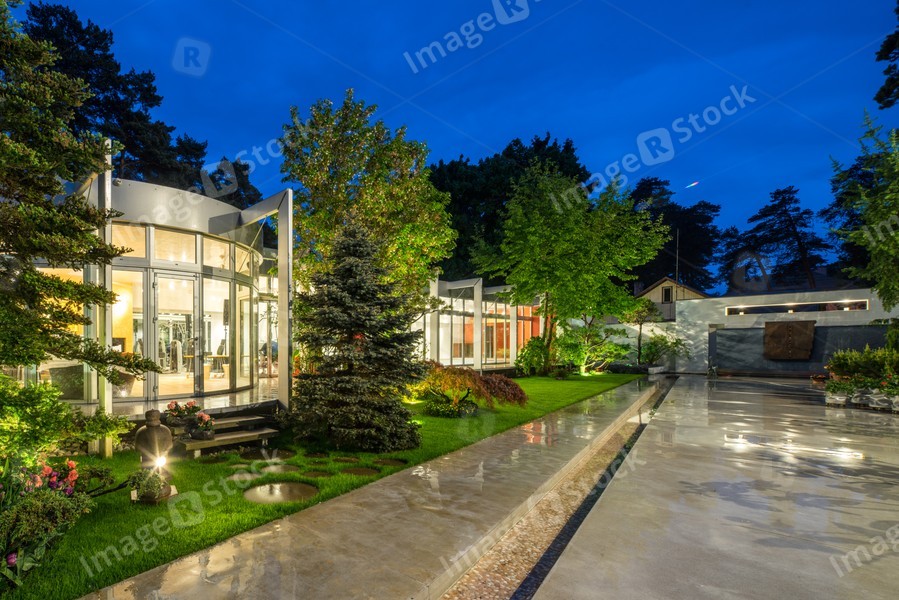 Modern exterior of luxury private house at twilight. Beautiful garden.