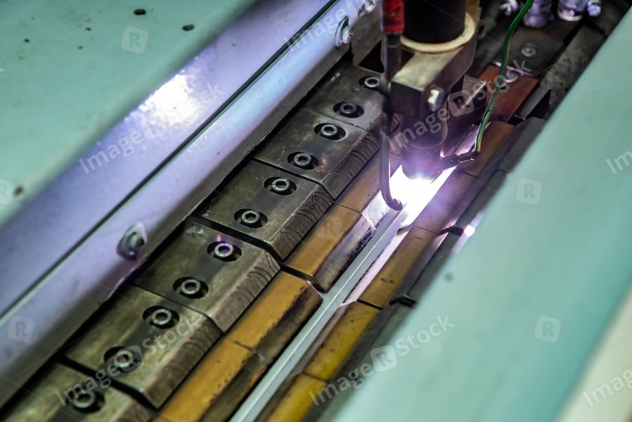Working overlap arc welding machine. Welded seam. Welding sparks.