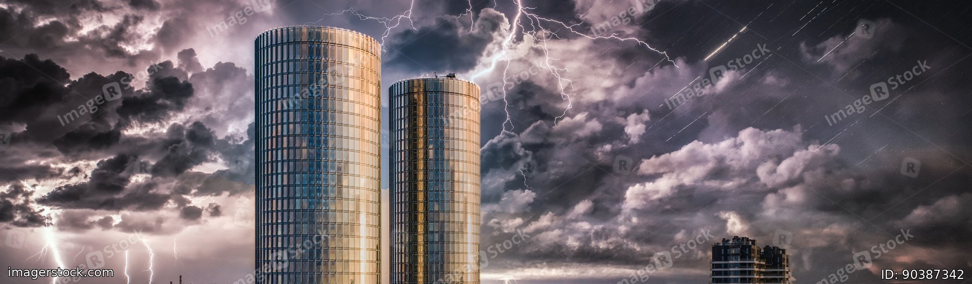 Urban architecture. Steel and glass facade of skyscrapers. Stormy sky.