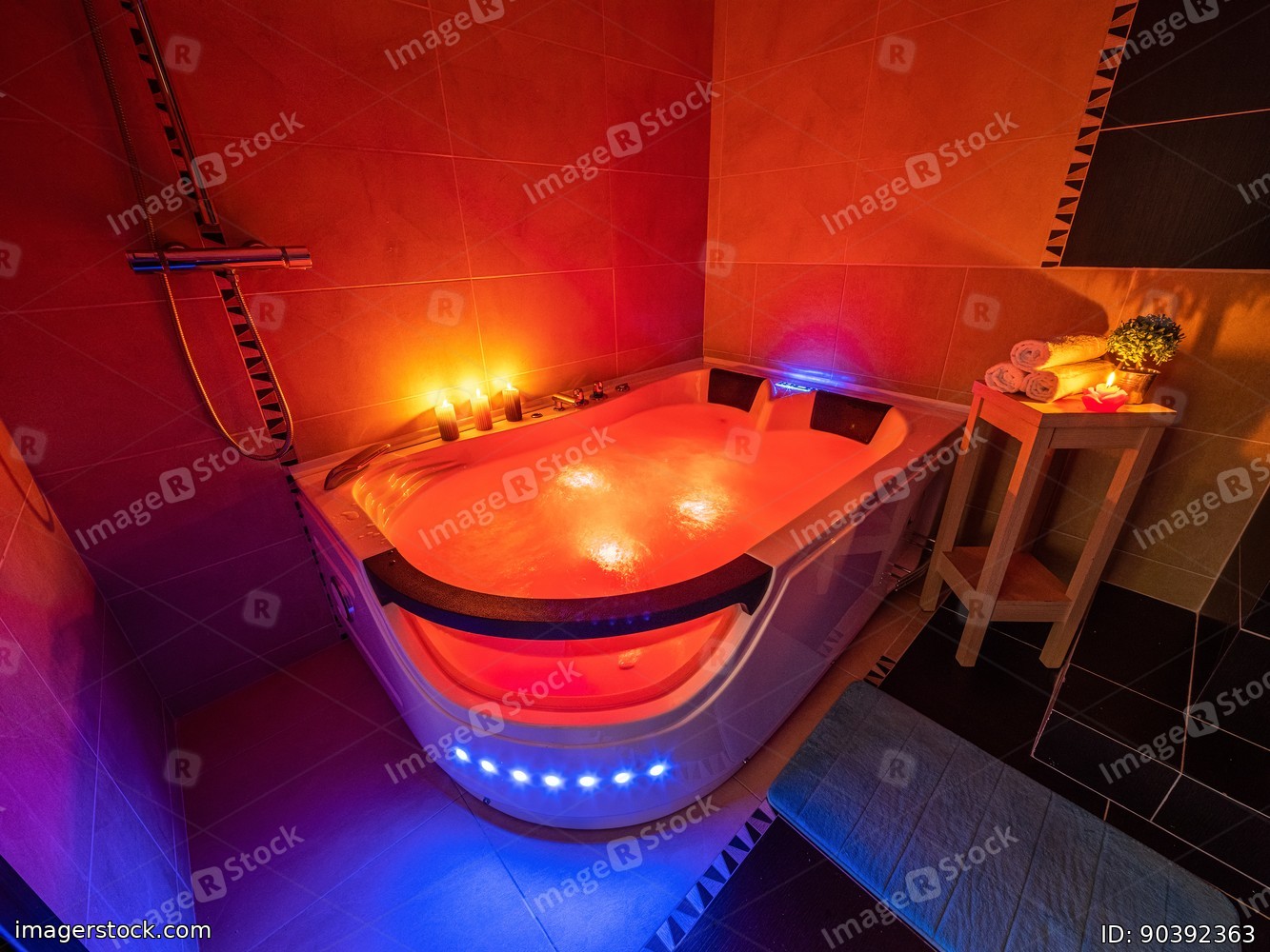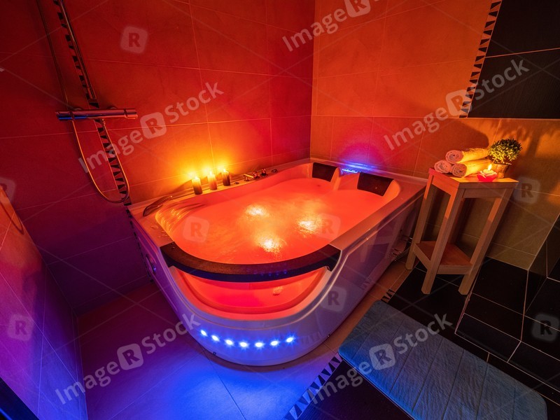 Illuminated massage bath with water. Luxury bathroom. Burning candles.