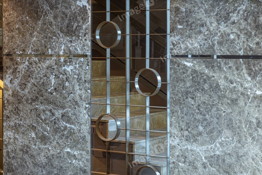 Reflection of stairs and wrought iron gating in mirror on marble wall.