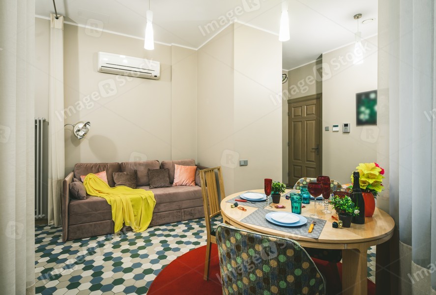 Modern interior of light studio apartment. Living room. Filtered.