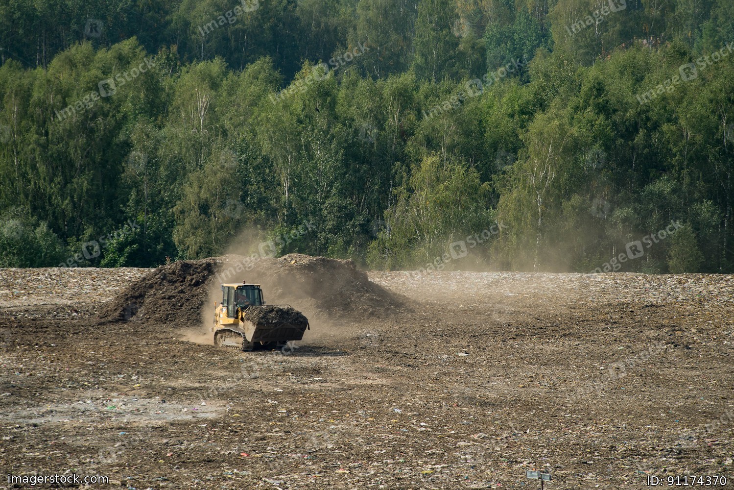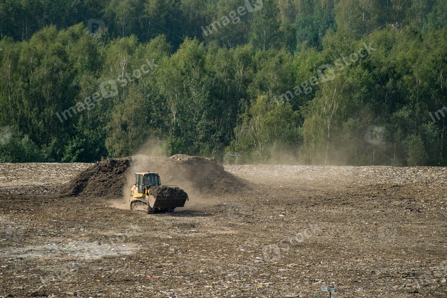 Huge dump of big city near forest. Tractor loader. Waste sorting. Preparation of trash for recycling.
