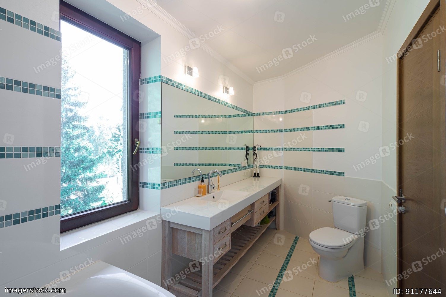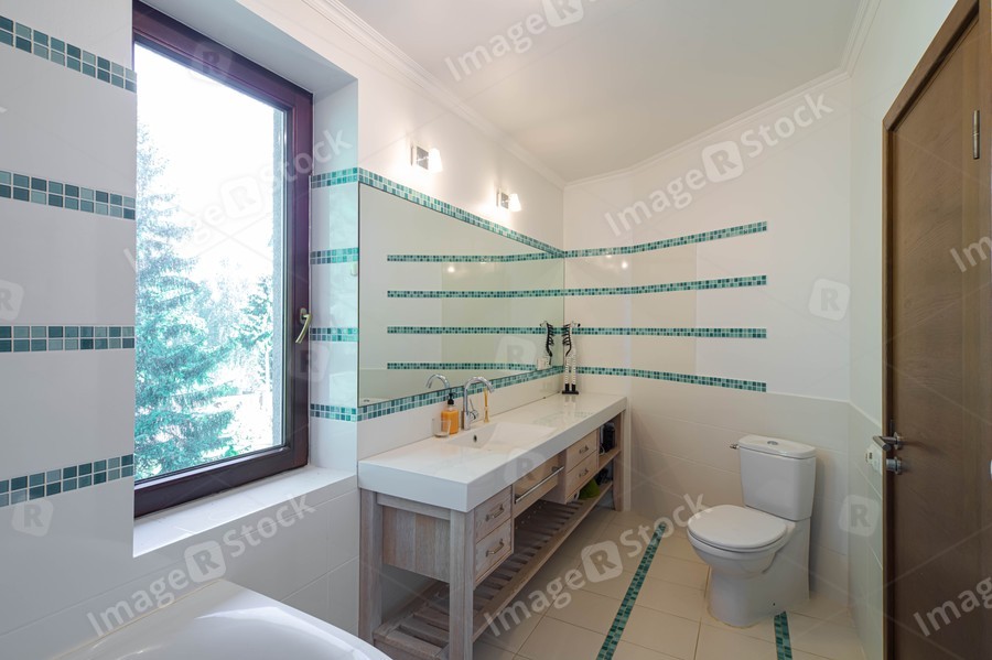 Modern light interior of luxury bathroom. White tile. Sink with mirror and toilet. Wooden door. Huge window.