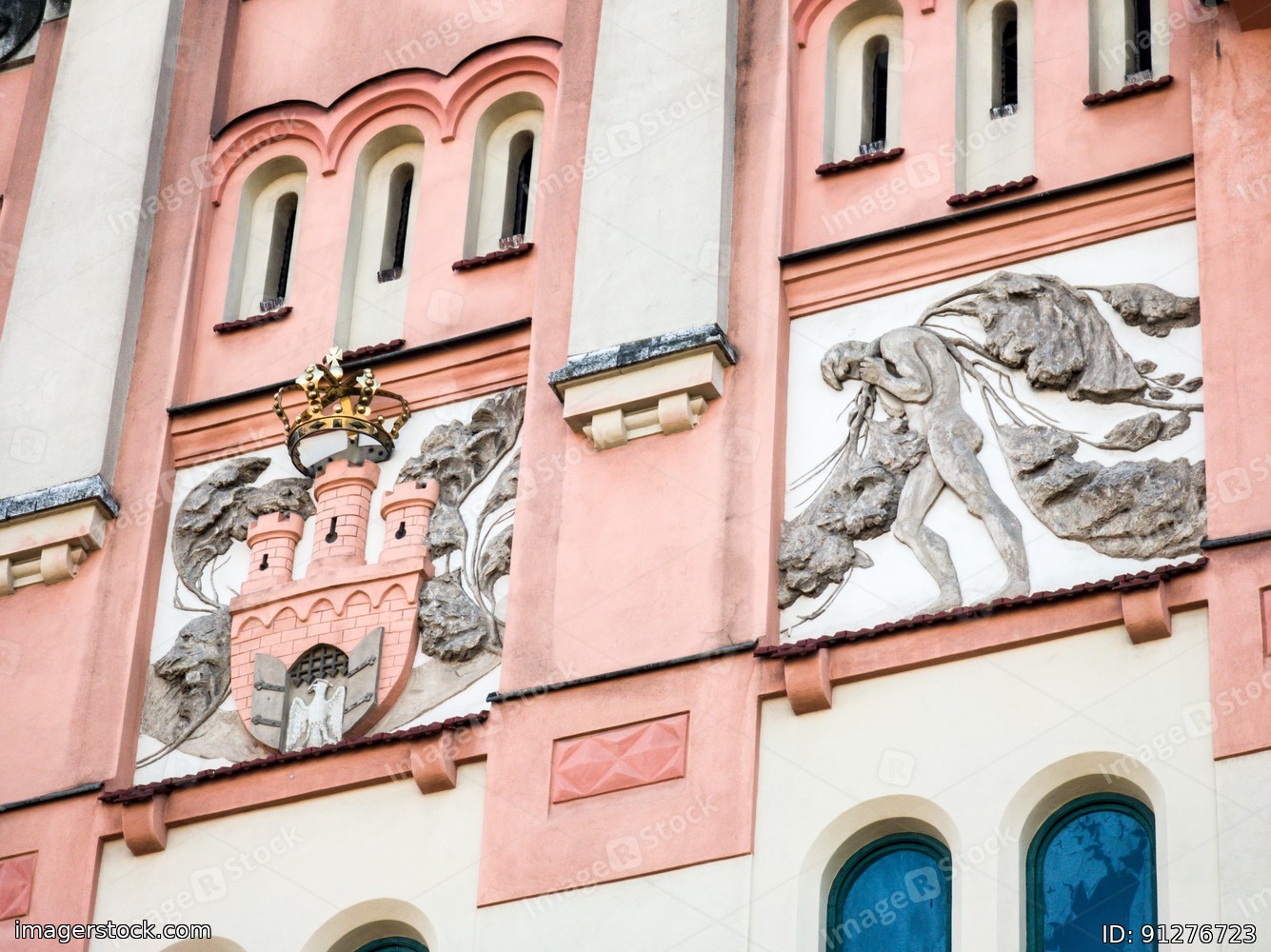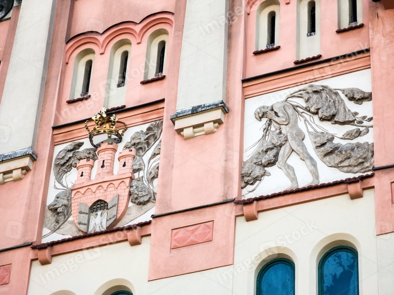 The facade of a modern building in Krakow. Coat of arms of the city.