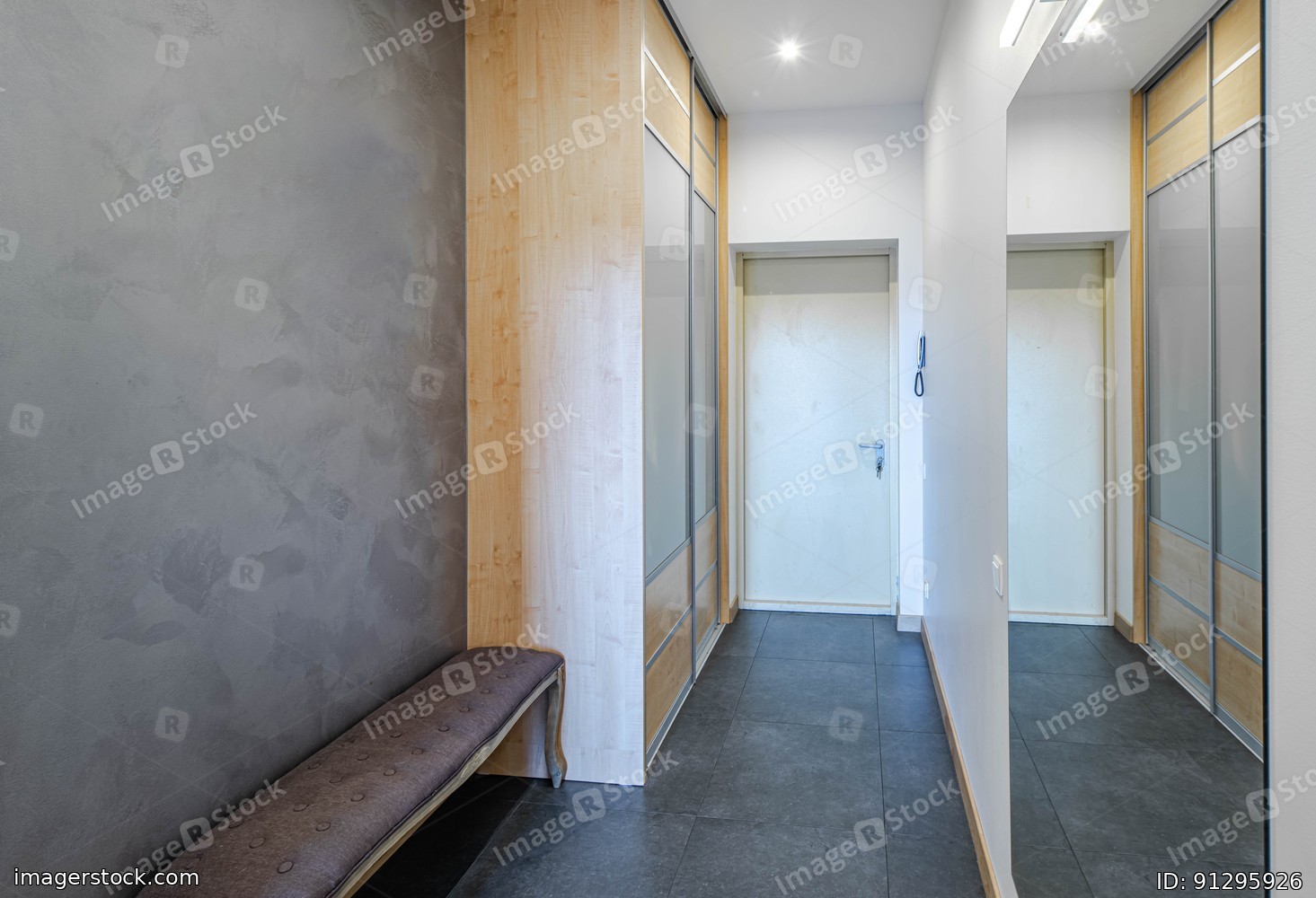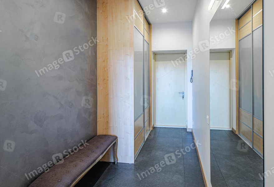 Modern interior of entrance hall in luxury apartment. Huge mirror with lamp. White walls. Wooden wardrobe.