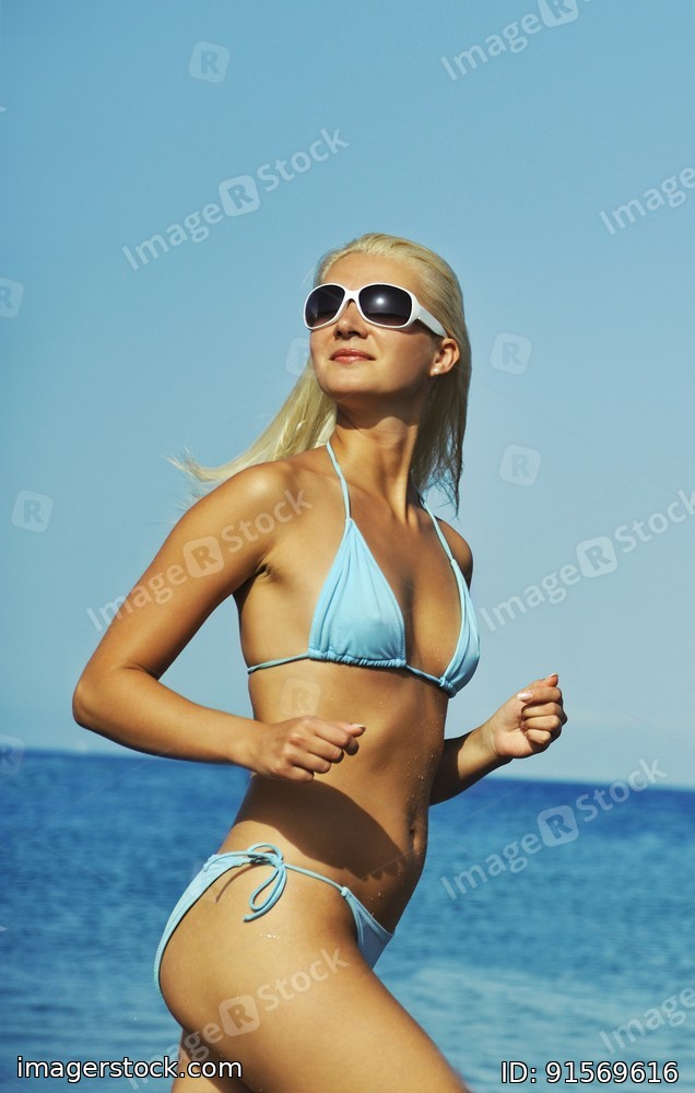 Happy young woman running in the sea